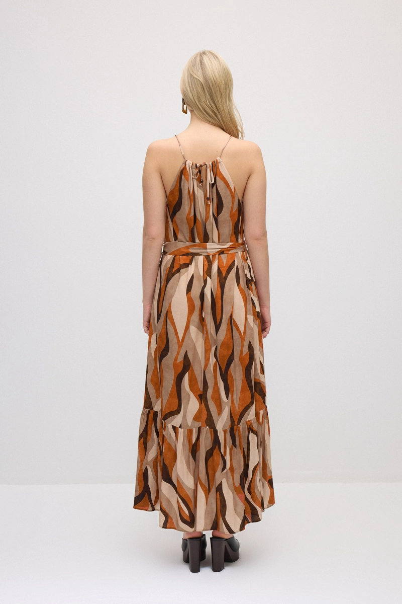 Bel kısmındaki kemer detayı ve boyundan bağlamalı tasarımıyla zarif ve feminen bir görünüm sunar. Desenli yapısı kombinlere enerjik bir hava katar. Akışkan kumaşı gün boyu konforlu bir kullanım sağlar. Günlük stilin yanı sıra özel kombinlerde de tercih edilebilecek şık bir alternatiftir. Hareketli formu stilinize dinamizm kazandırır.