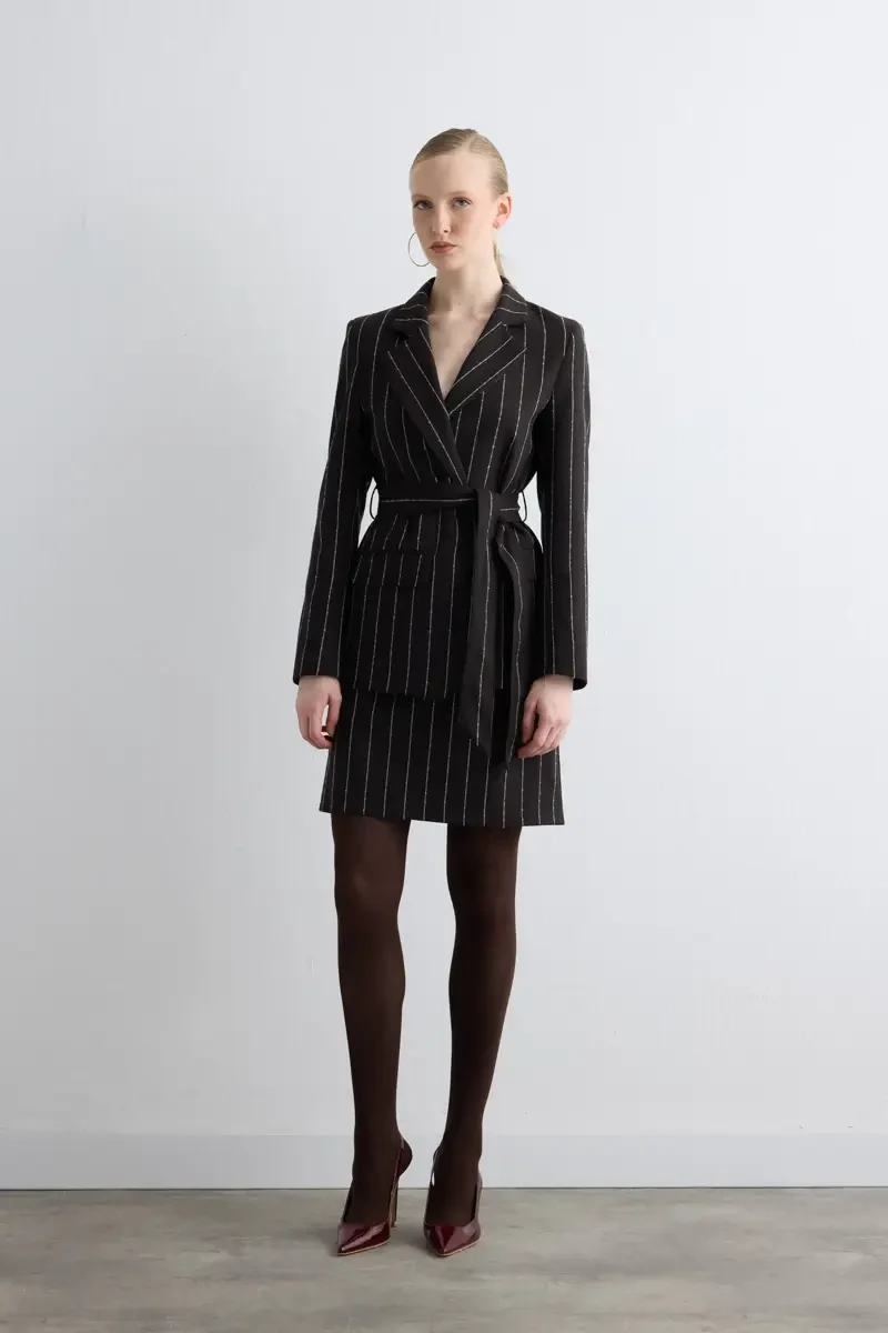Beli kemer silueti vurgular ve şıklık katar. Çizgili detayları modern bir hava sunar. Yünlü yapısı soğuk havalarda rahatlık sağlar. Kahverengi tonu farklı alt parçalarla uyum sağlar. Minimal kesimiyle klasik ve modern tarzı birleştirir.