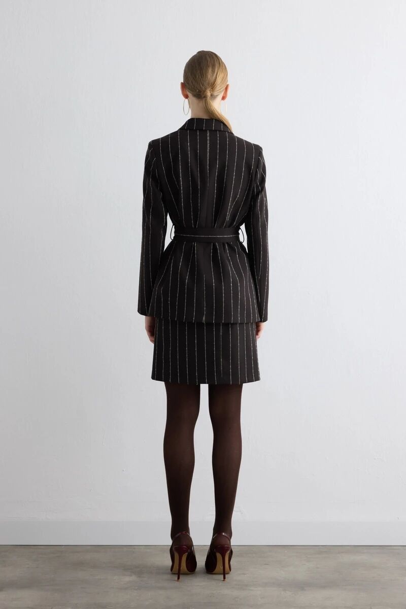 Beli Kemerli Çizgili Yünlü Ceket & Mini Etek - Kahverengi Takım