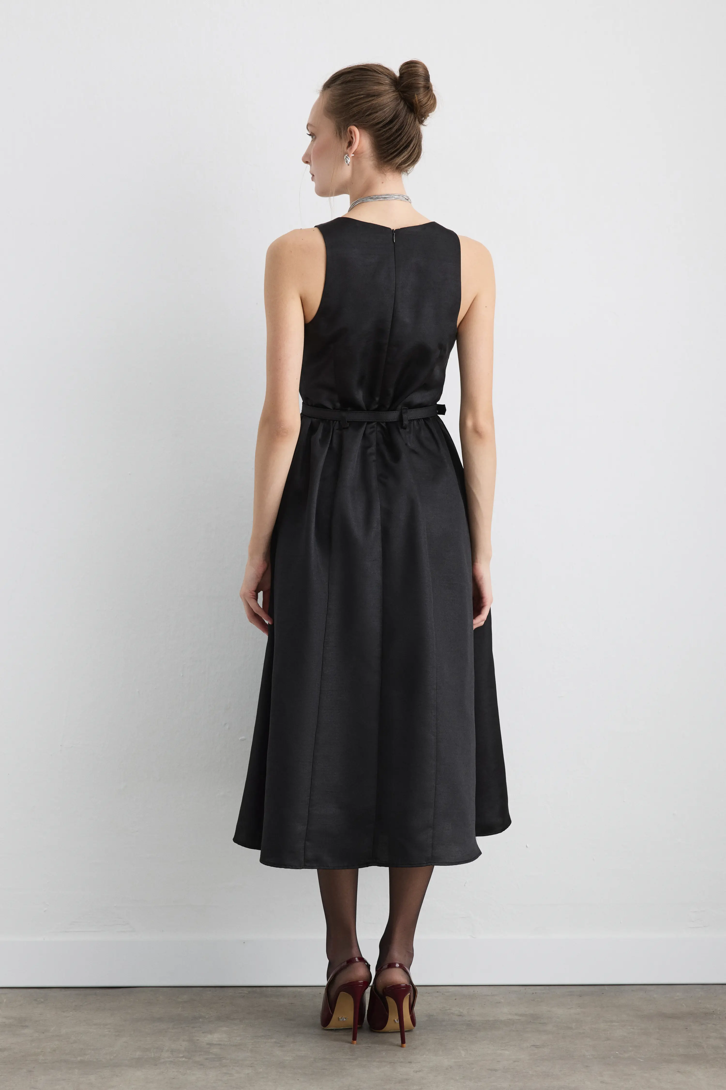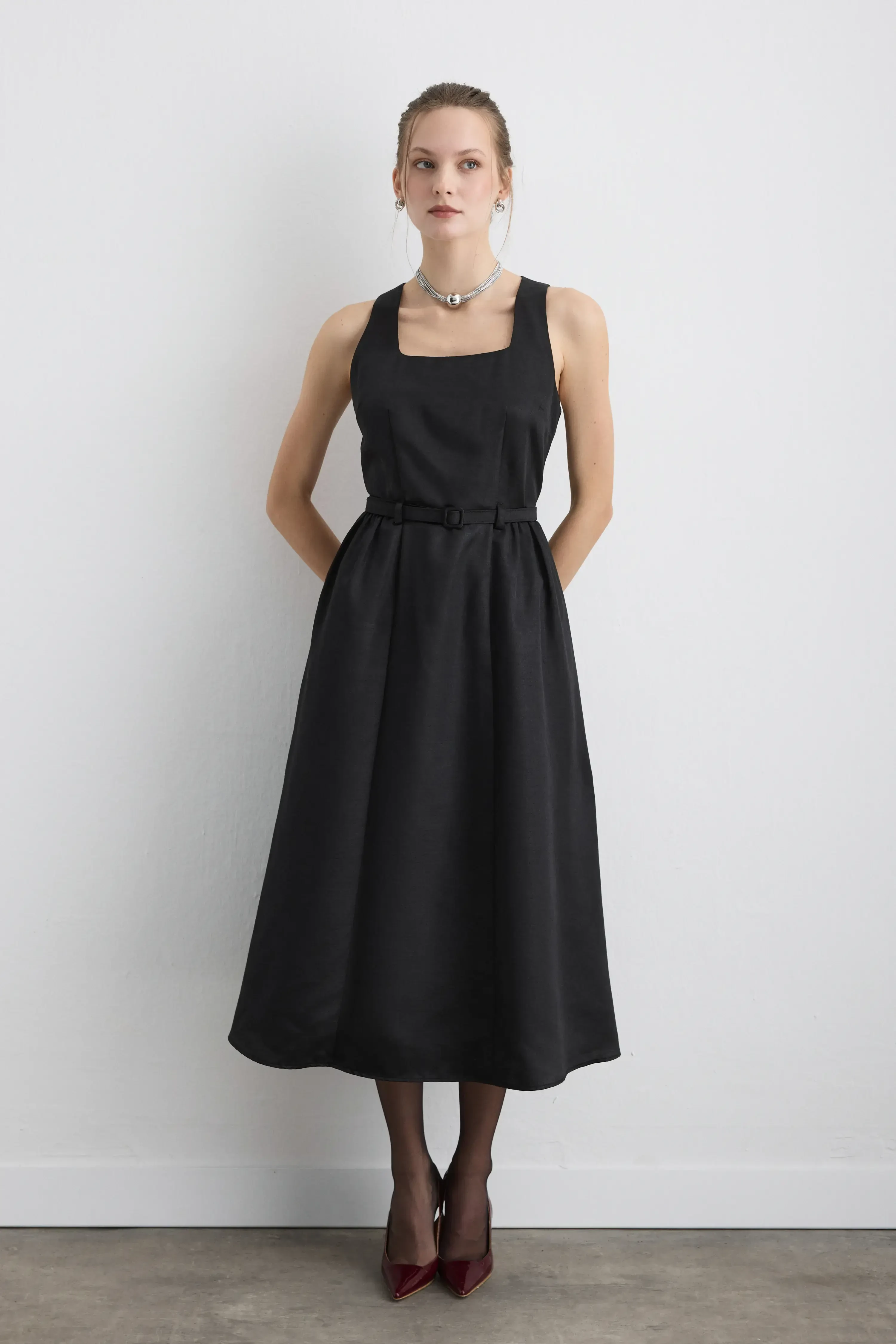 Kare yaka kesimi ve tafta dokusu ile zarif bir siluet yaratıyor. Beldeki kemer detayı vücut hatlarını vurgulayarak feminen bir denge sağlıyor. Özel davetlerde sade ama iddialı bir görünüm sunuyor.