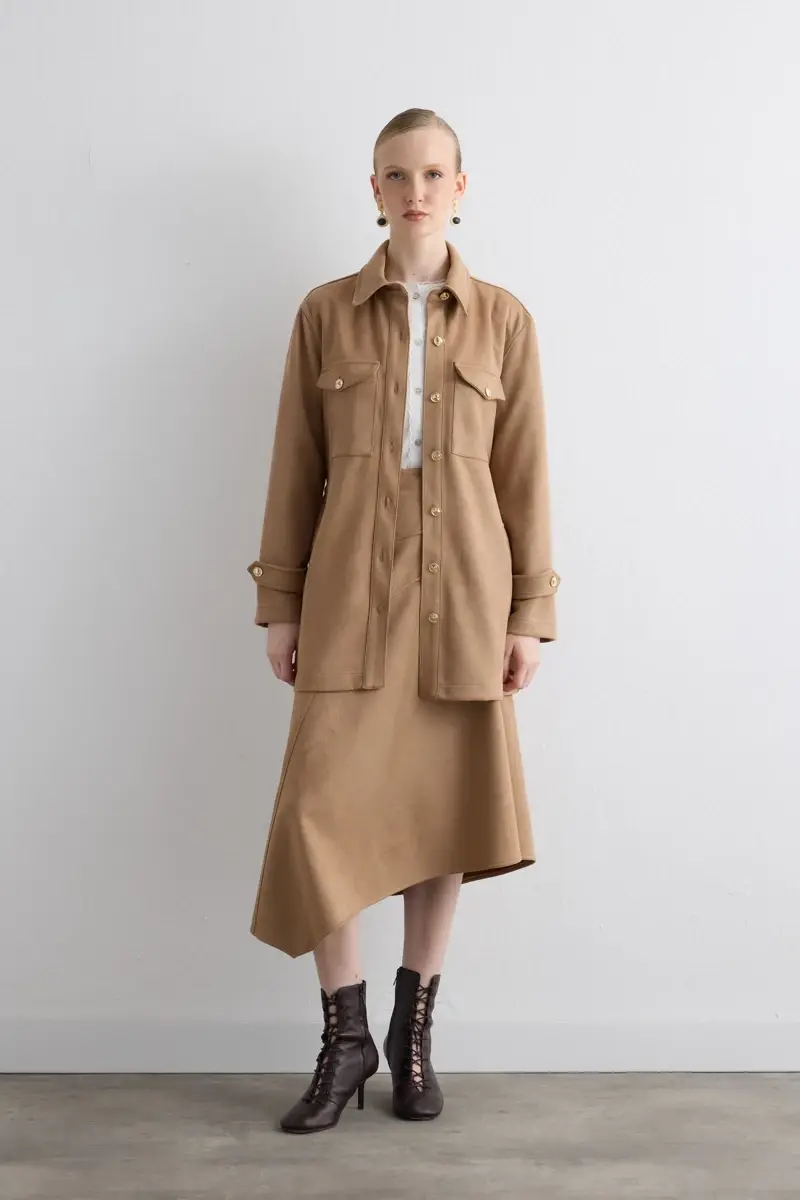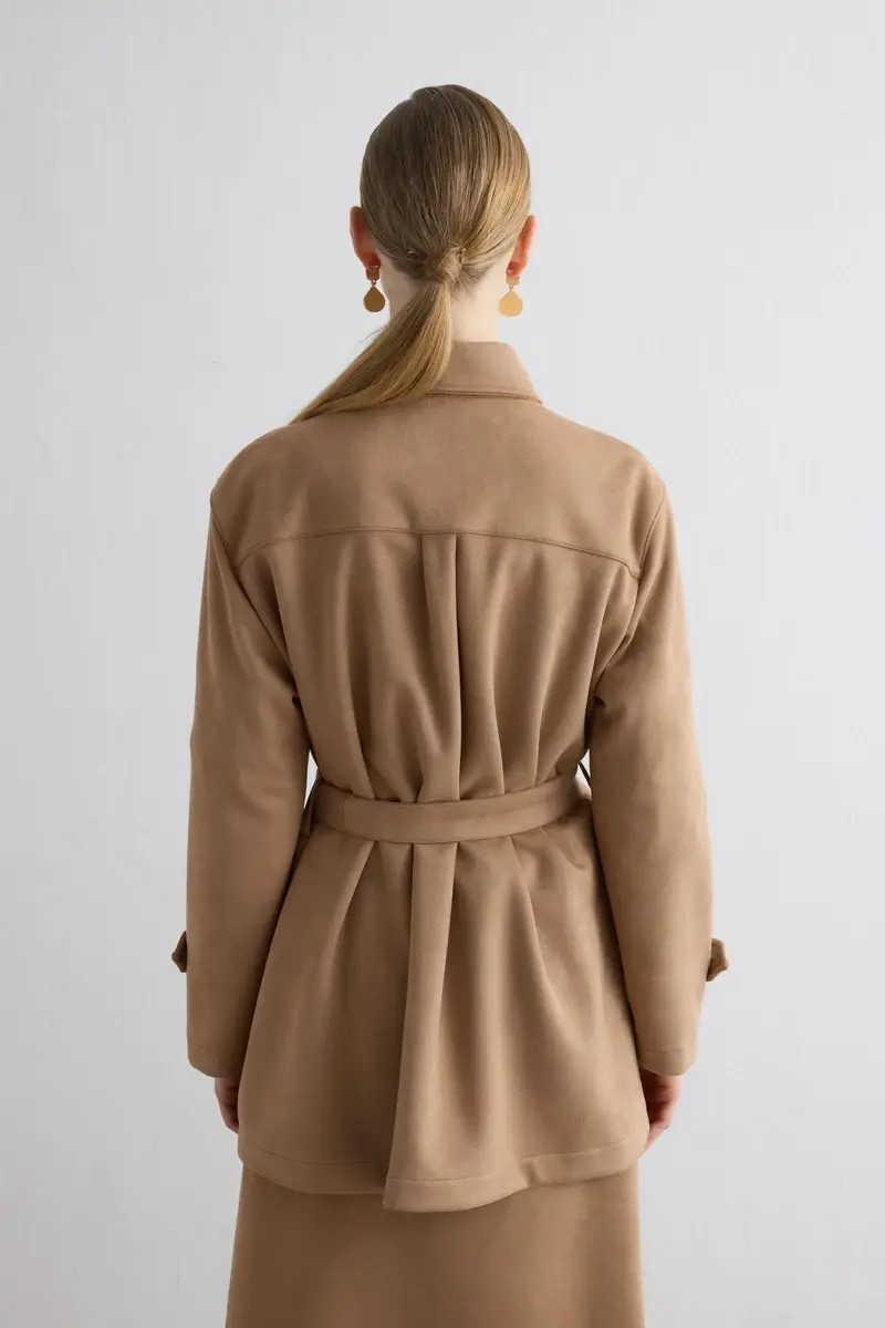 Beli Kemerli Süet Ceket & Asimetrik Kesim Etek - Bej Takım