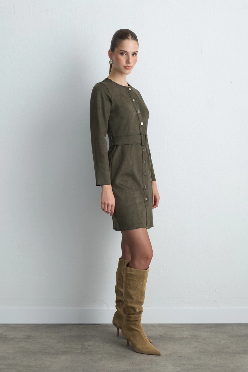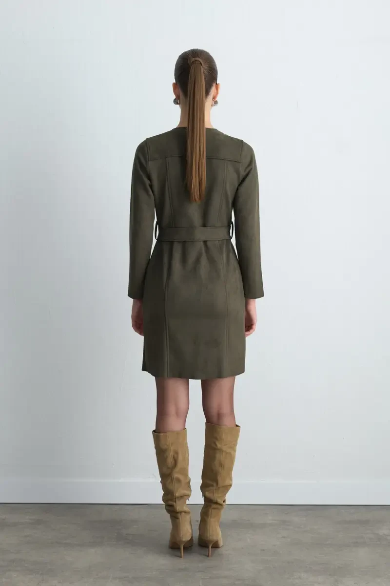 Kemer detayı bel vurgusunu ön plana çıkarır. Süet dokusu modern ve sofistike bir hava katar. Haki tonu doğal bir şıklık sağlar. Hem günlük hem şehirli kombinler için ideal bir parçadır.