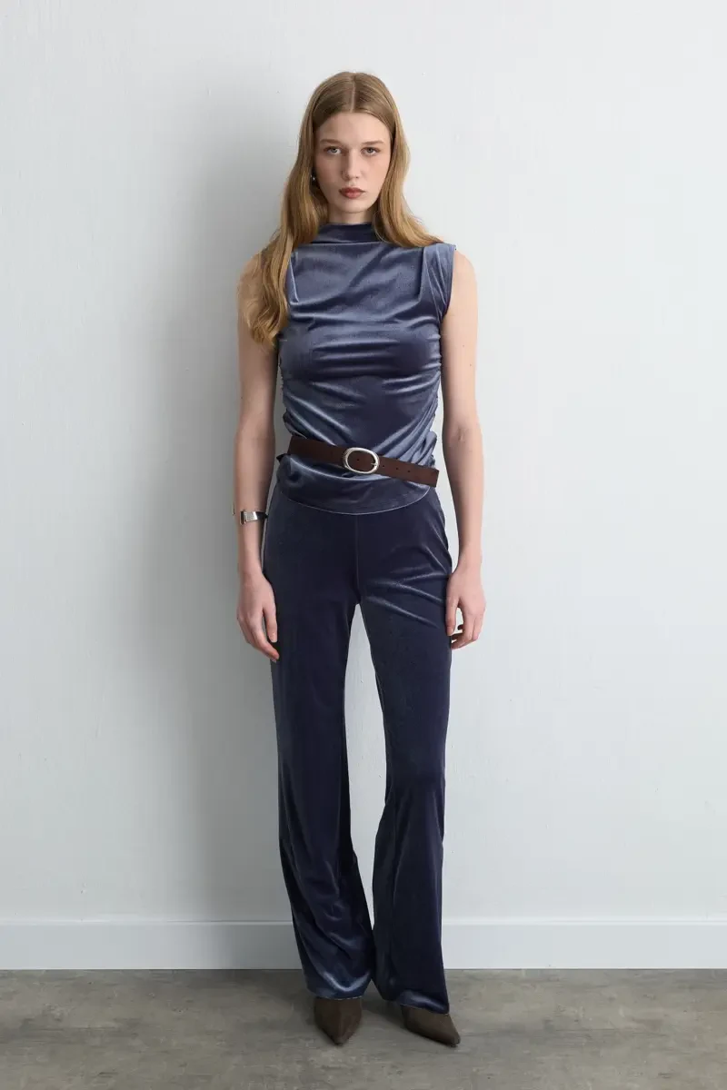 Kadife dokusu yumuşaklığıyla lüks bir his verir. Gri tonu modern ve zarif bir görünüm oluşturur. Bol paça kesimi rahat bir duruş kazandırır. Beli lastikli formu gün boyu konfor sağlar. Hem şık hem de rahat kombinlerin vazgeçilmez parçasıdır.
