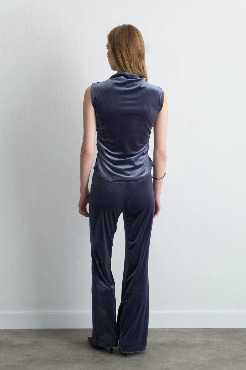 Kadife dokusu yumuşaklığıyla lüks bir his verir. Gri tonu modern ve zarif bir görünüm oluşturur. Bol paça kesimi rahat bir duruş kazandırır. Beli lastikli formu gün boyu konfor sağlar. Hem şık hem de rahat kombinlerin vazgeçilmez parçasıdır.