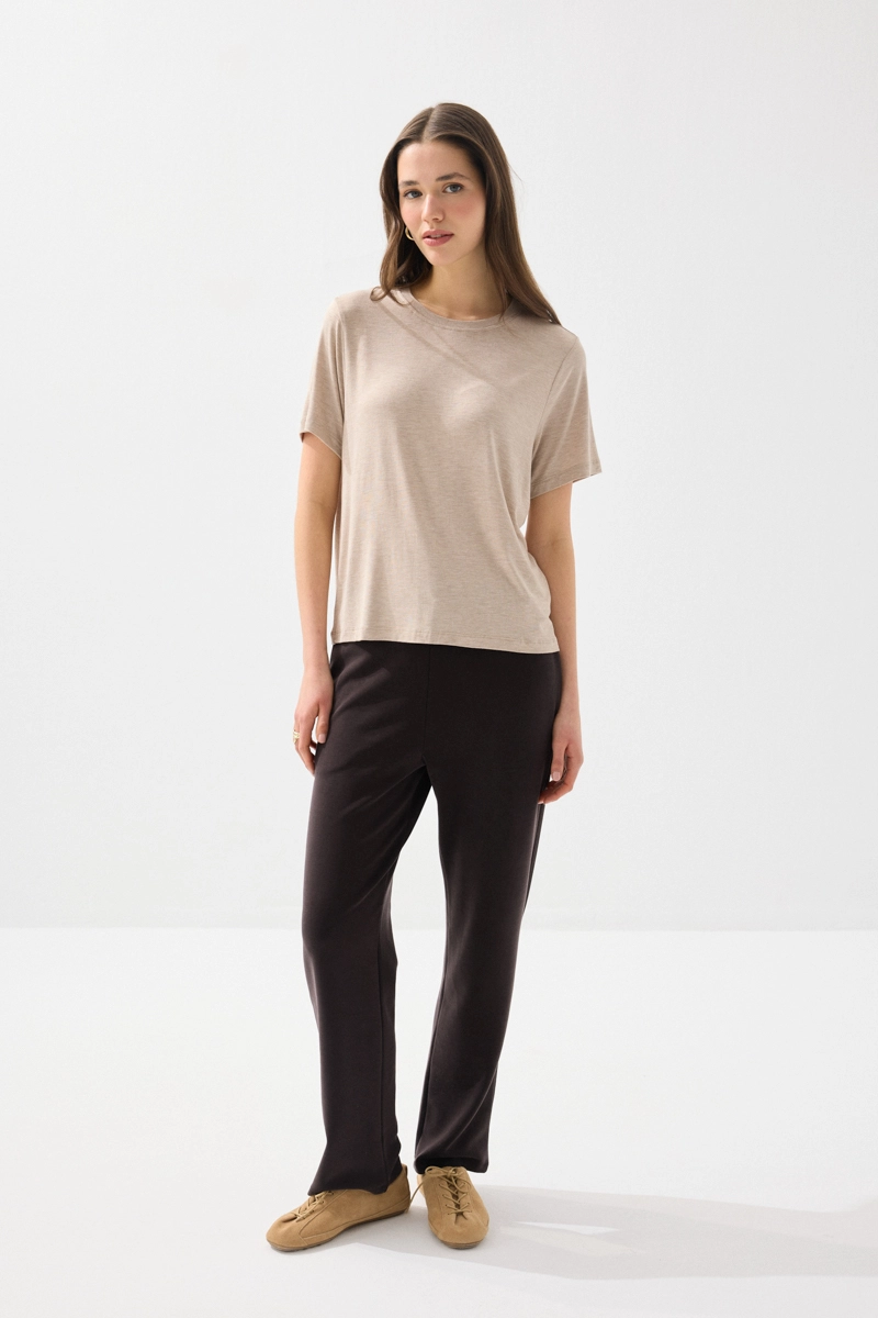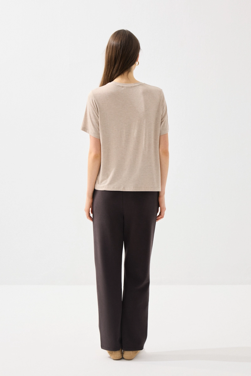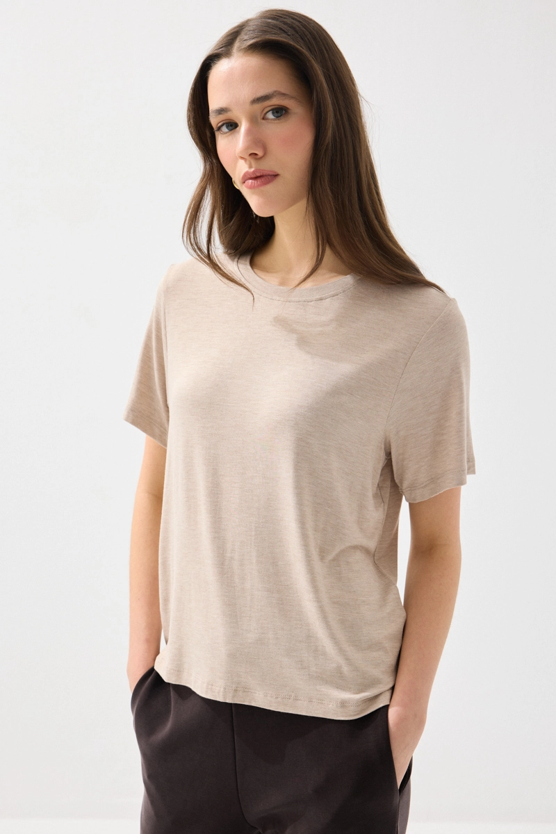 Bambu karışımlı kumaşıyla nefes alabilen ve yumuşak bir kullanım sunan t-shirt, melanjlı dokusuyla hareketli bir görünüm sağlar. Bisiklet yaka tasarımıyla sade ve kullanışlıdır. Bej rengiyle doğal ve rahat kombinler oluşturabilirsiniz. Günlük kullanım için ideal bir parçadır. Konforlu ve şık bir alternatif sunar.