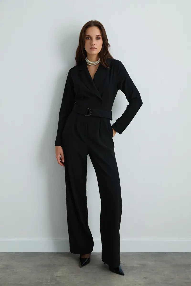 Black jumpsuit with a blazer collar combines style and sophistication, offering a modern silhouette. Crepe fabric provides a graceful drape and flowing appearance. Suitable for everyday wear as well as special occasion outfits. Minimal details create a sophisticated look.