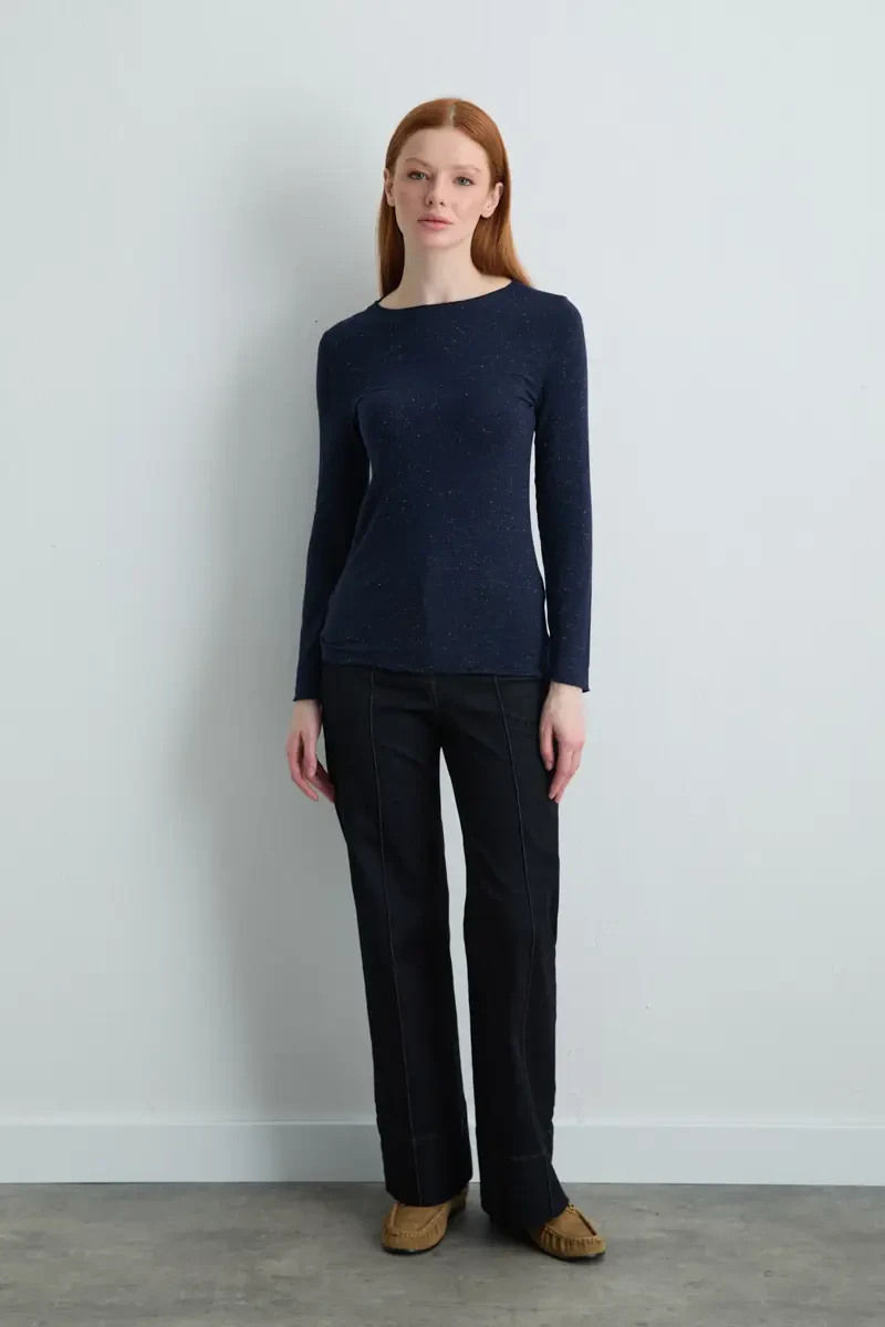 This blouse with a chic boat-neck cut presents an elegant silhouette, subtly reflecting light with fine glitter details. Its cashmere blend provides a soft feel and pairs perfectly with classic trousers or skirts.