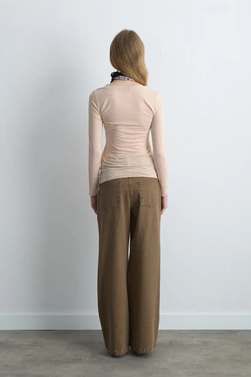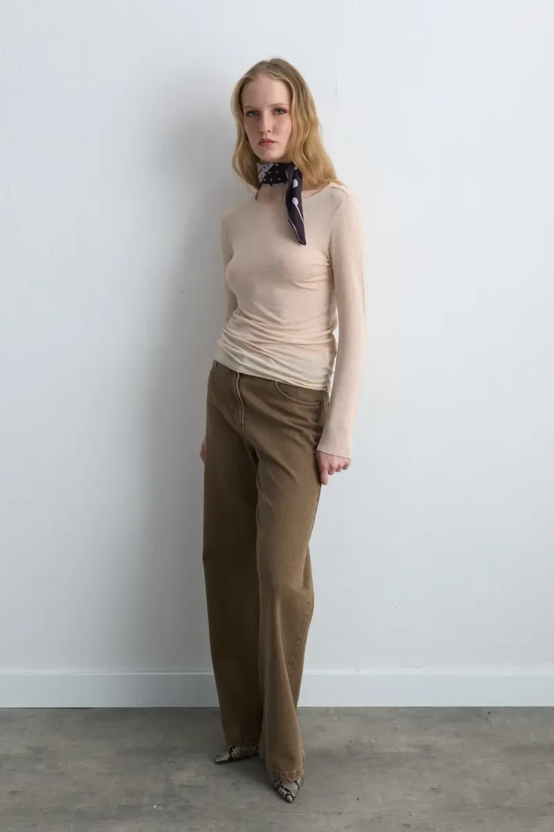 The ecru bateau-neck cashmere blouse with shimmering details offers modern elegance and a refined look. The soft texture of cashmere provides comfort, while its sparkling design makes it an elegant choice for special occasions. In daily outfits, it creates a striking look when paired with simple pieces.