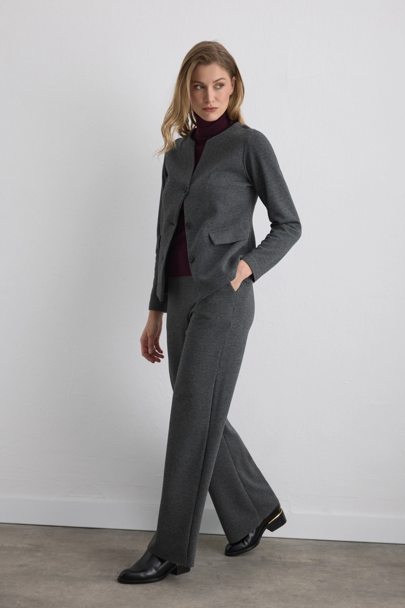 The gray tone provides a sophisticated and neutral style. The houndstooth pattern adds classic elegance. The wide-leg cut creates a modern and comfortable silhouette. The soft texture ensures all-day comfort. One of the standout pieces in office and city outfits.