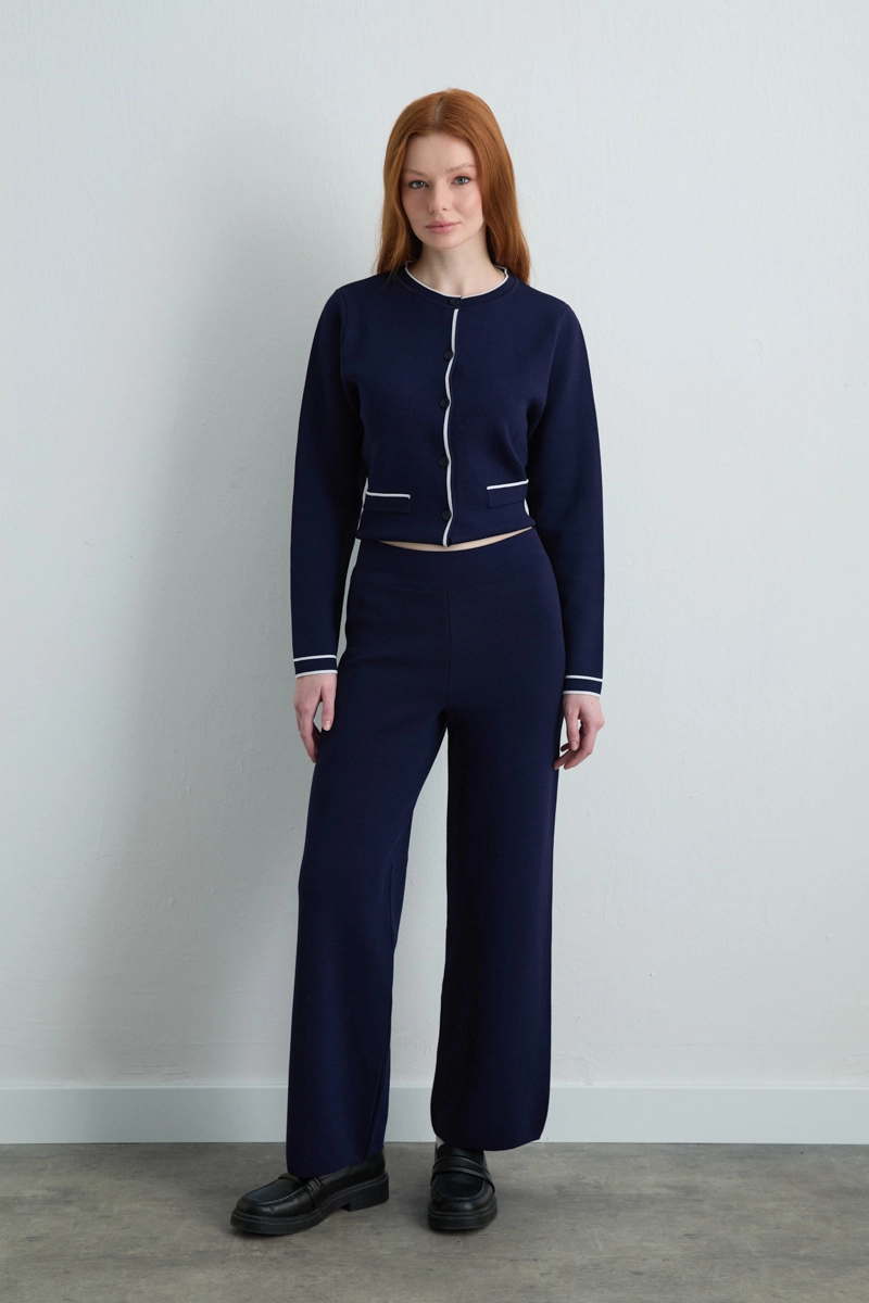 Lacivert renkli triko pantolon, bol paça kesimiyle klasik ve şık bir görünüm kazandırır. Yumuşak ve esnek yapısı, gün boyu rahat kullanım sunar. Günlük ve ofis kombinlerine uyum sağlayan modern bir parçadır.