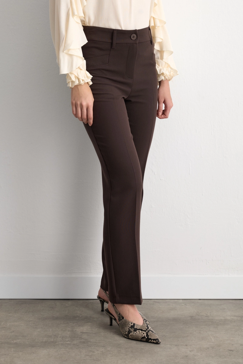 Klasik boru paça kesimiyle zamansız bir görünüm sunar. Kahverengi tonu sıcak ve sofistike bir hava kazandırır. Ofis kombinlerinden günlük stil seçeneklerine kadar rahatlıkla kullanılabilir. Blazer ceketlerle tamamlandığında profesyonel bir şıklık elde edilir.