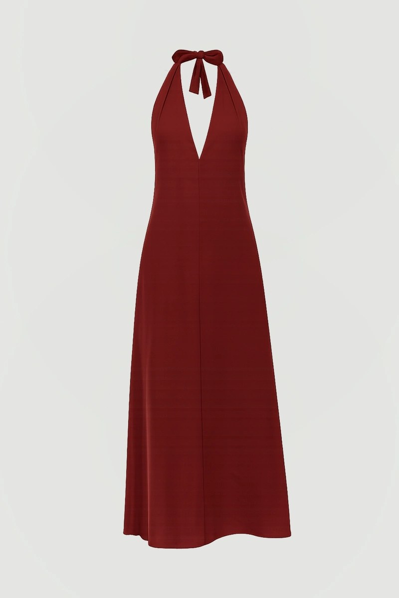 Tencel kumaşıyla hafif ve nefes alabilen bir yapı sunar. Boyundan bağlamalı tasarımı zarif bir görünüm kazandırır. Uzun kesimi feminen bir siluet oluşturur. Kiremit tonu sıcak ve dikkat çekici bir stil sunar.