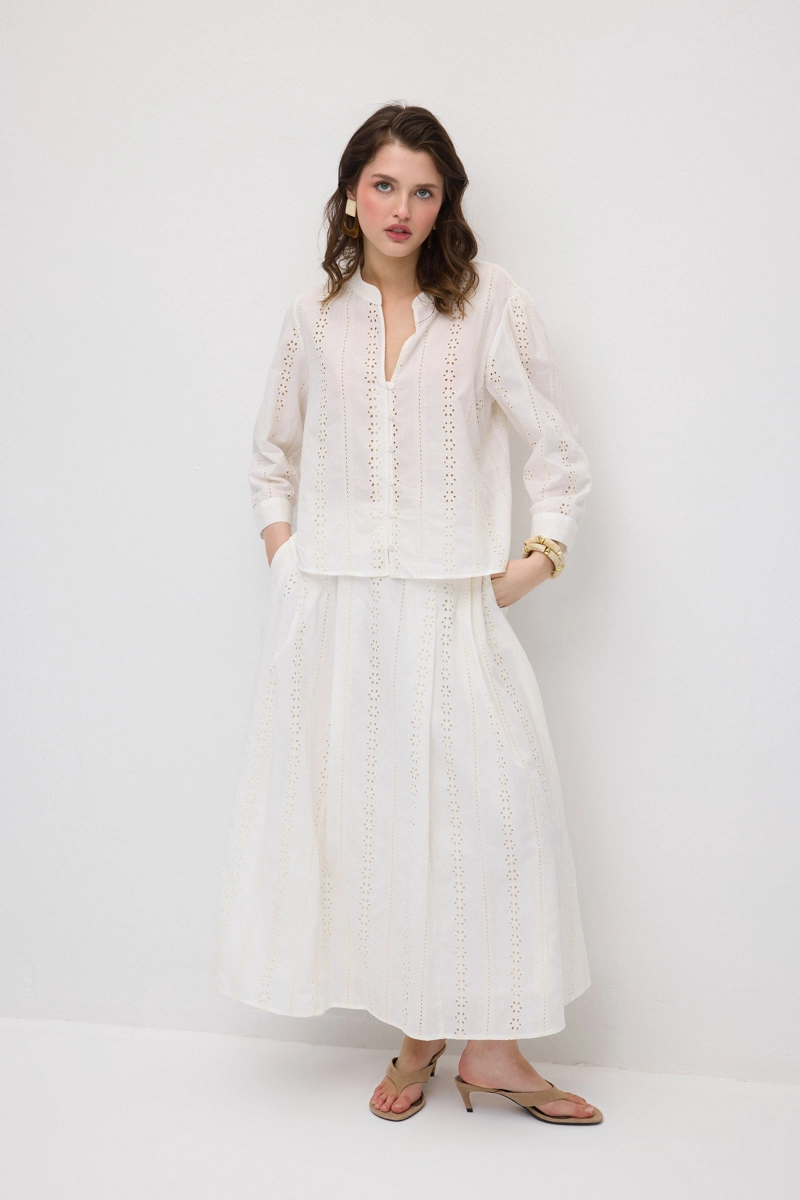 Brode detaylarıyla zarif ve feminen bir görünüm sunar. Pamuklu dokusu sayesinde konforlu bir kullanım sağlar. Beyaz rengiyle ferah ve zamansız bir stil oluşturur. Günlük ve şık kombinlere kolayca uyum sağlar.