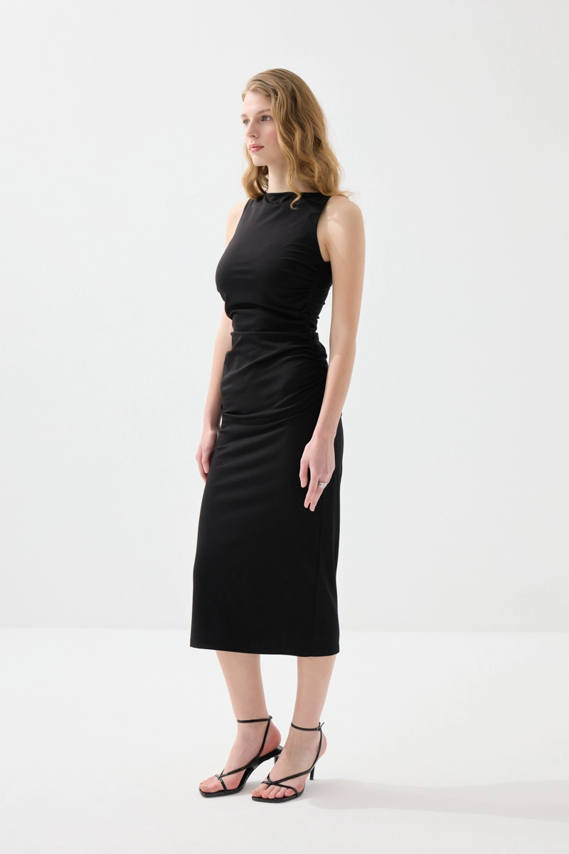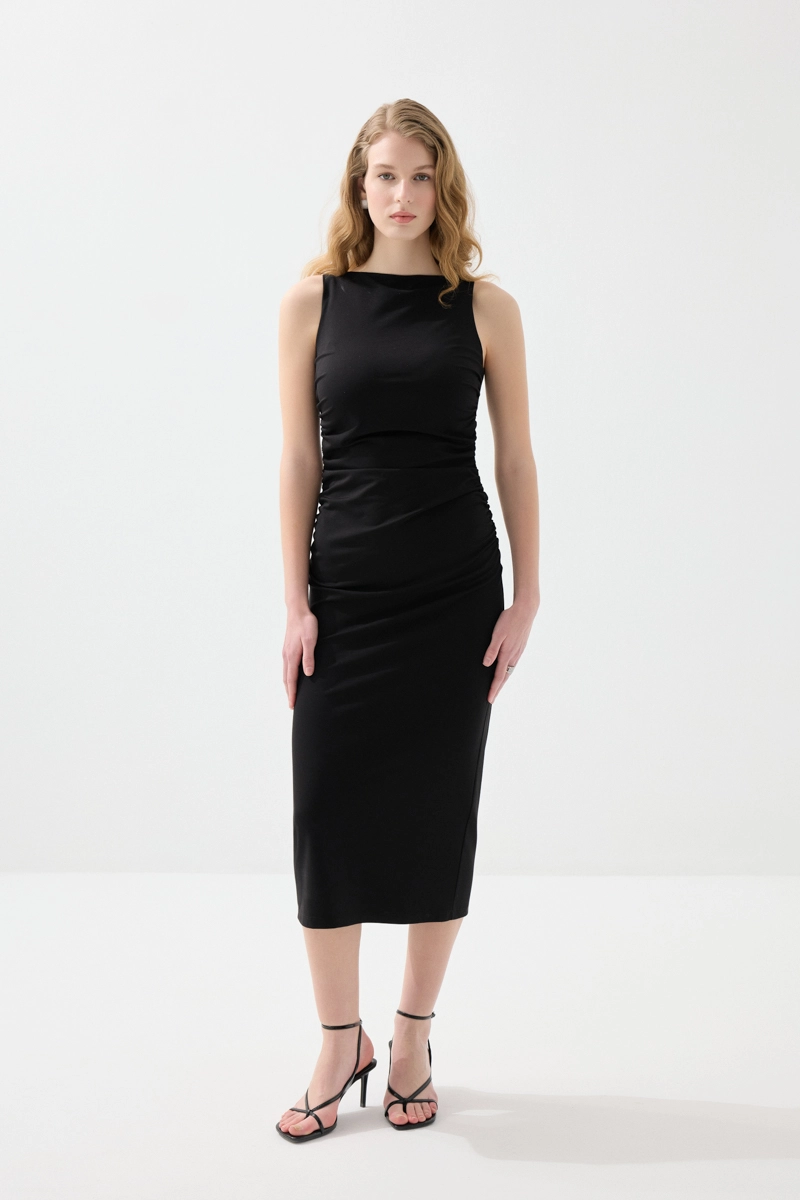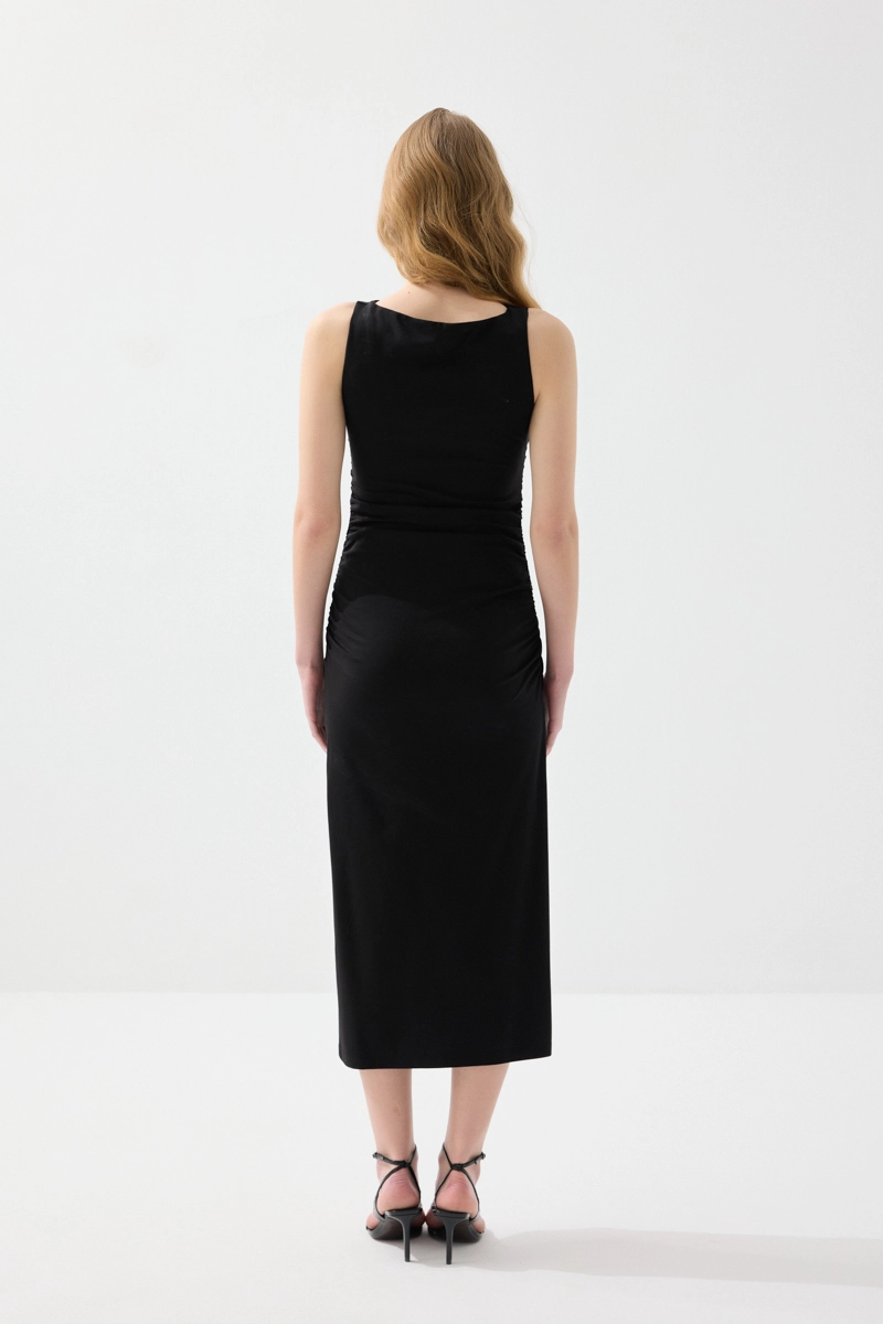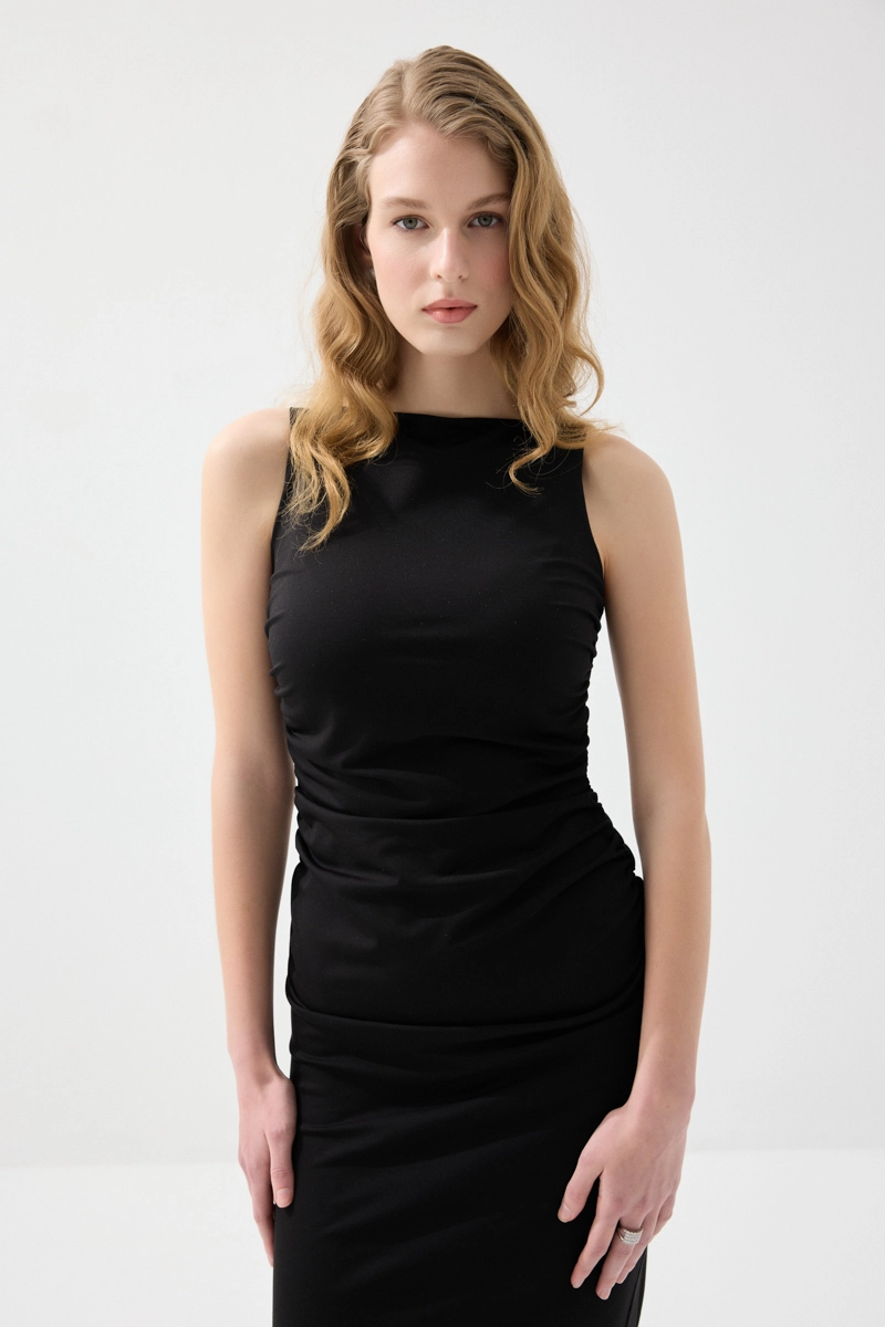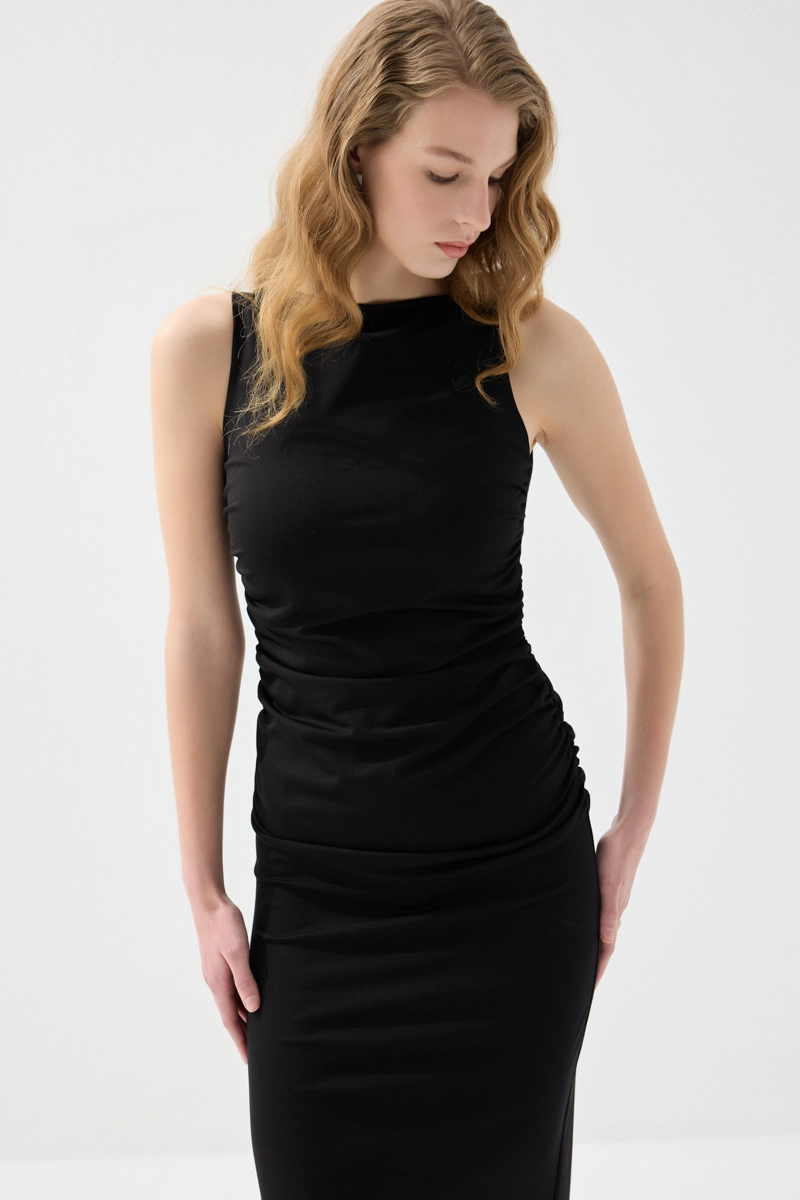 Zarif yaka detayı ve büzgülü yapısıyla feminen bir görünüm sunar. Likralı kumaşı sayesinde vücuda uyum sağlayarak konforlu bir kullanım sağlar. Uzun formu, şık ve etkileyici bir siluet oluşturur. Siyah tonuyla klasik ve göz alıcı bir stil sunar. Özel davetlerde tercih edilebilecek güçlü bir parçadır.
