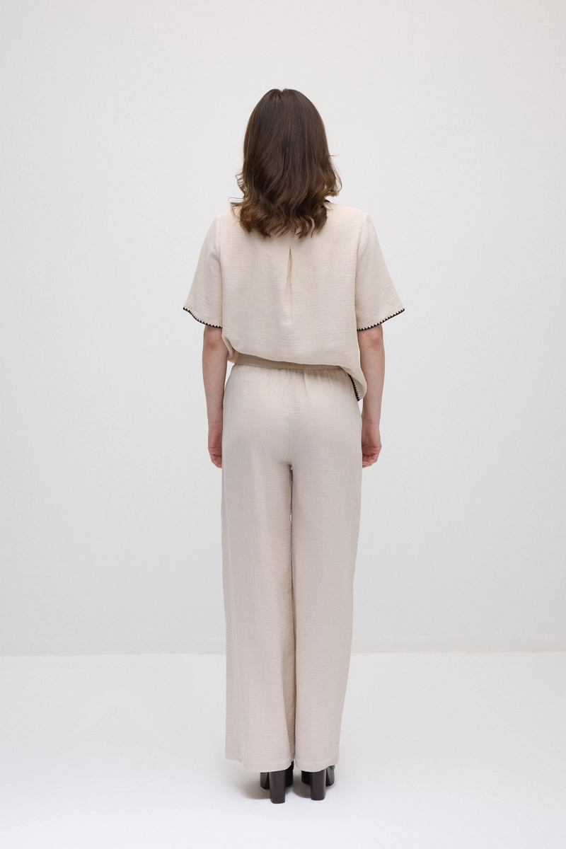 Cep detaylarında yer alan zarif nakışlar tasarıma şık ve özgün bir dokunuş katar. Müslin kumaşı sayesinde hafif, yumuşak ve nefes alabilen bir yapı sunar. Rahat kesimi gün boyu konfor sağlarken hareket özgürlüğü sunar. Günlük stil ve yaz kombinleri için ideal bir alternatif oluşturur. Doğal ve sade duruşuyla farklı parçalarla kolayca uyum sağlar.
