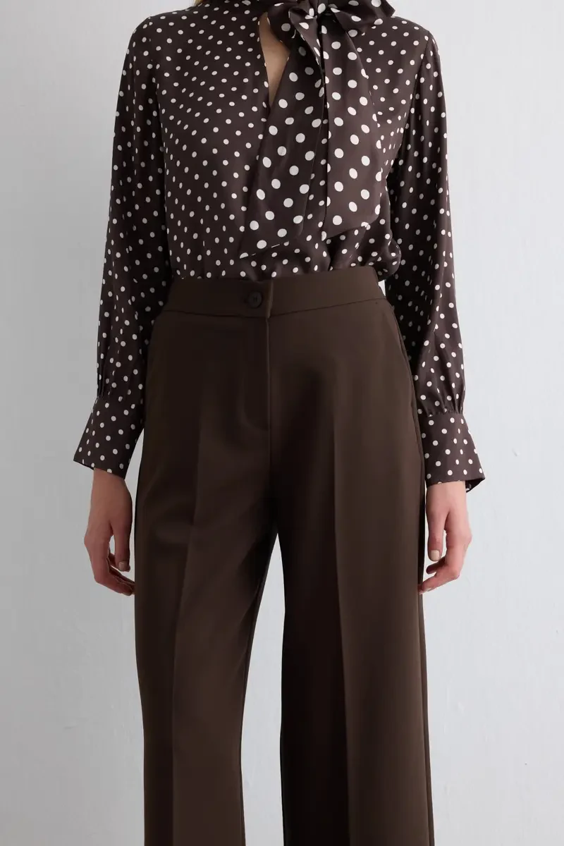 Geniş paça kesimiyle modern bir duruş kazandırır. Cepli tasarımı pratiklik sunarken şıklığı da destekler. Kahverengi tonu, doğal ve sofistike bir görünüm sağlar. Hem ofis kombinlerinde hem günlük kullanımda rahatlıkla tercih edilebilir. Akışkan formu gün boyu konforlu bir kullanım imkânı verir.