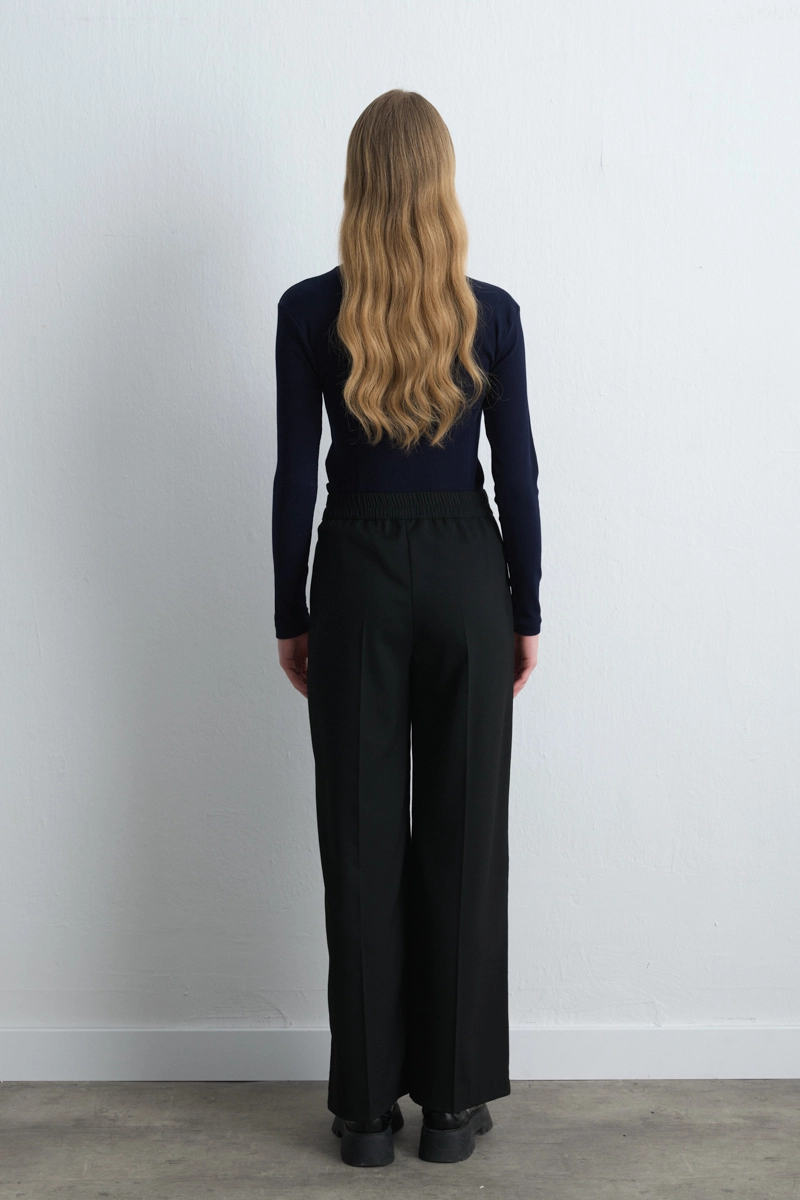 These black pocketed palazzo pants combine elegance and comfort, offering a modern stance with their wide cut. Side pockets add functionality, while the flowing fabric creates a graceful silhouette. Easily styled from office to casual settings.