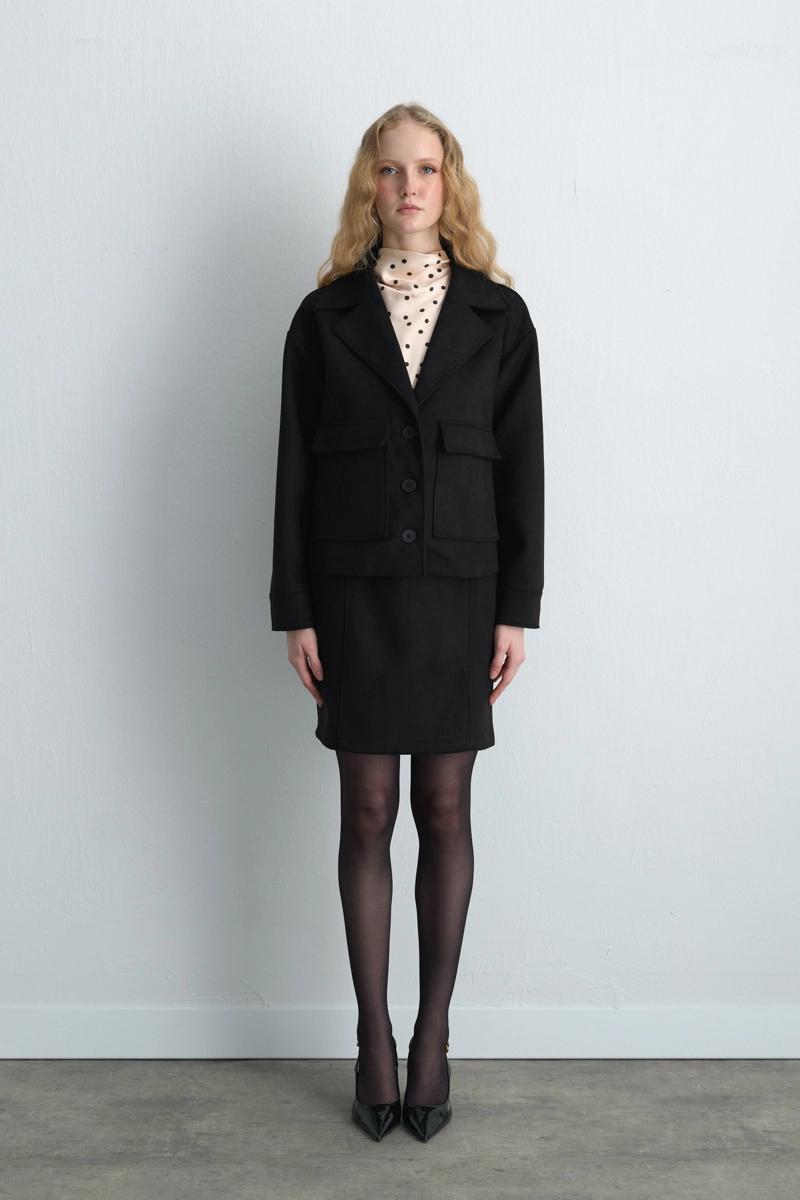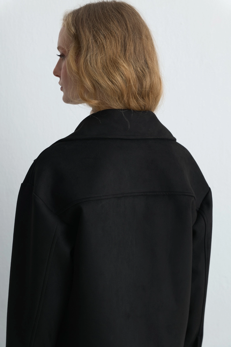 Süet dokusu sofistike bir görünüm kazandırır. Cepli tasarımı işlevsellik sunar. Siyah tonu zamansız bir şıklık sağlar. Günlük ve şehirli kombinlerde güçlü bir tamamlayıcıdır.