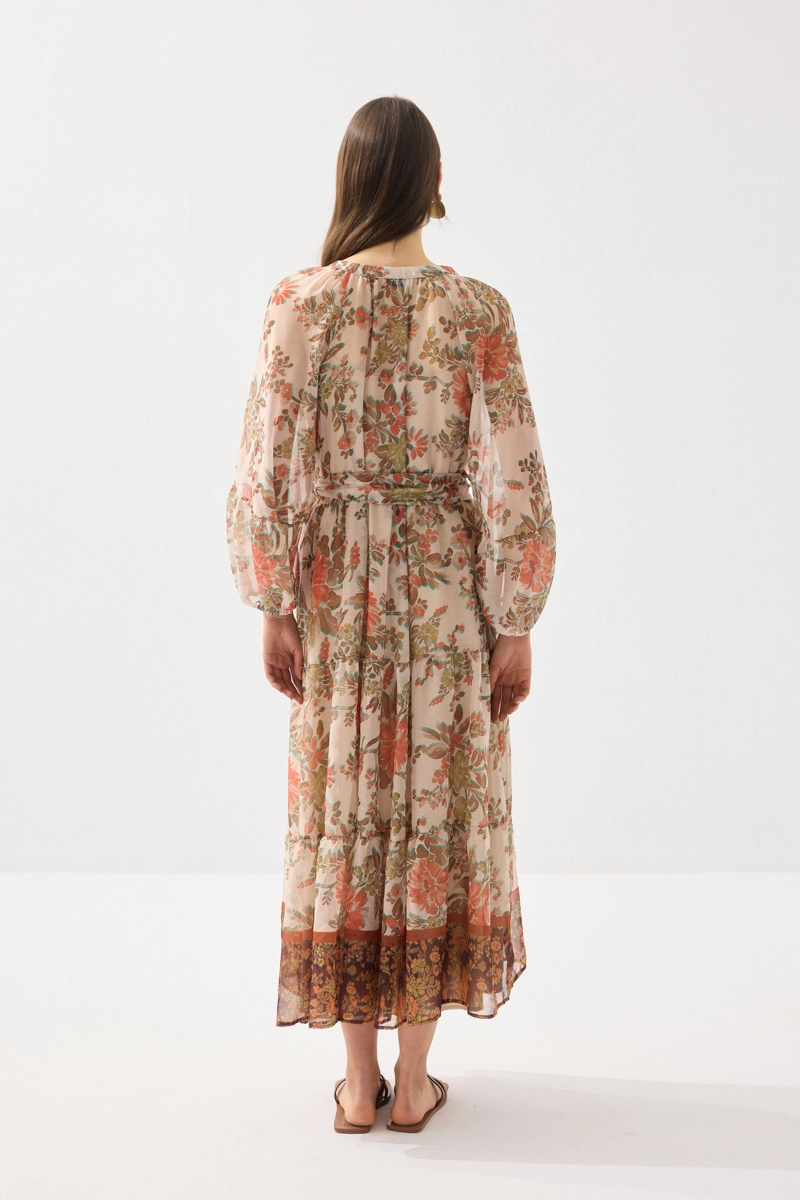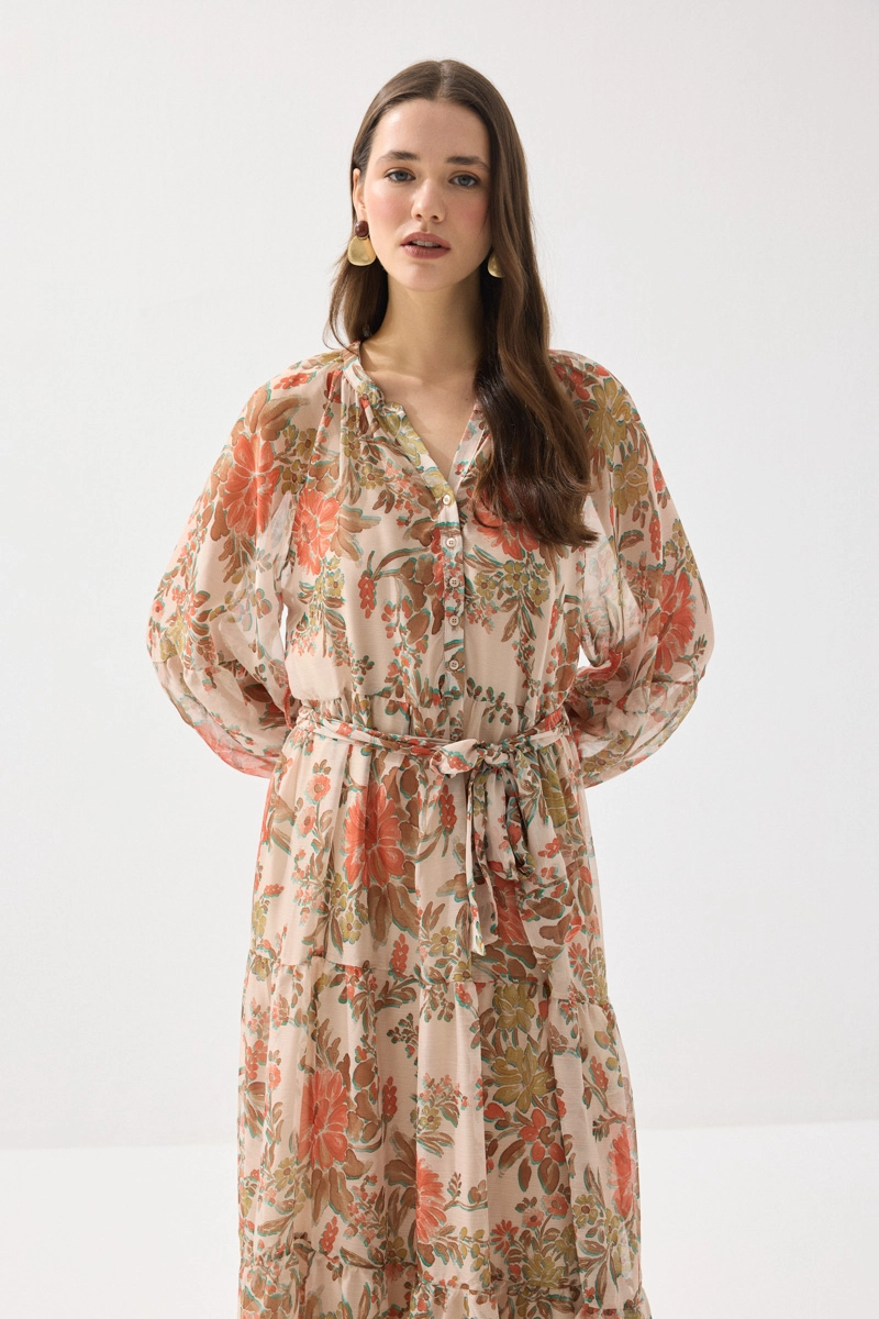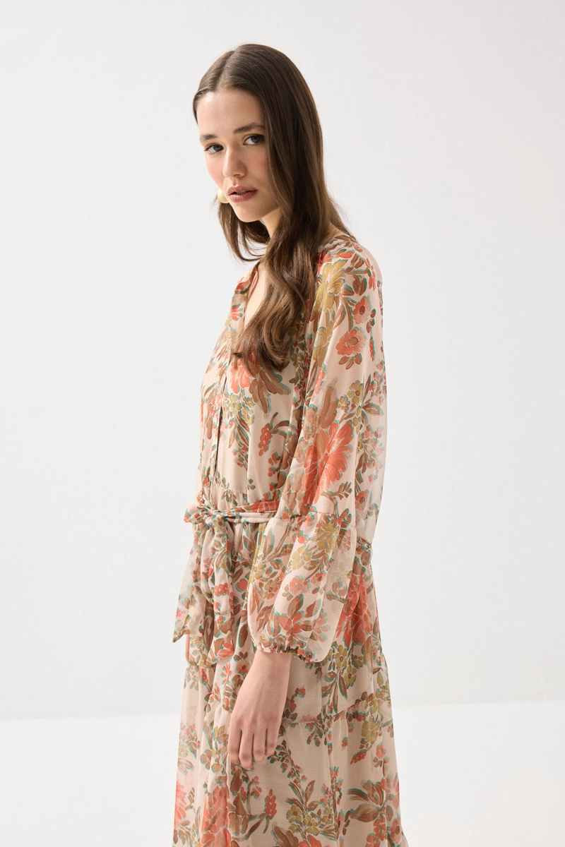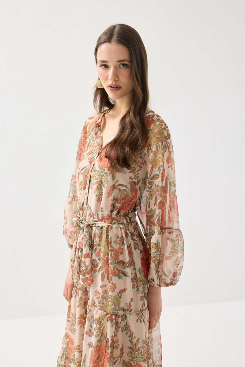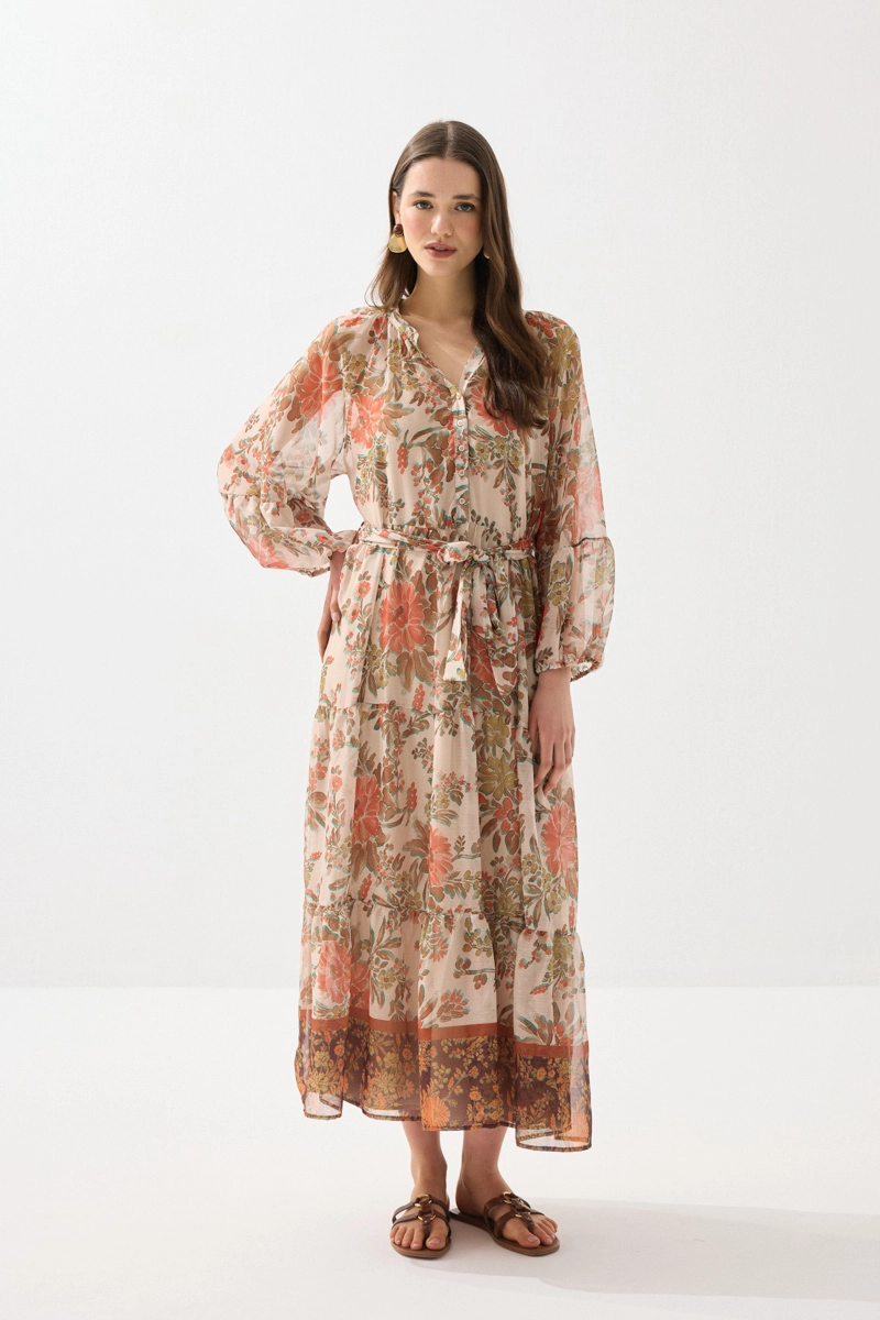 Hafif ve akıcı şifon kumaşıyla zarif bir görünüm sunan uzun elbise, çiçek desenleriyle romantik bir stil yaratır. Hareketli yapısı sayesinde gün boyu konfor sağlar. Turuncu tonlarıyla enerjik ve dikkat çekici kombinler oluşturabilirsiniz. Özel günlerde ve yaz davetlerinde şıklıkla tercih edilebilir. Feminen ve etkileyici bir parçadır.