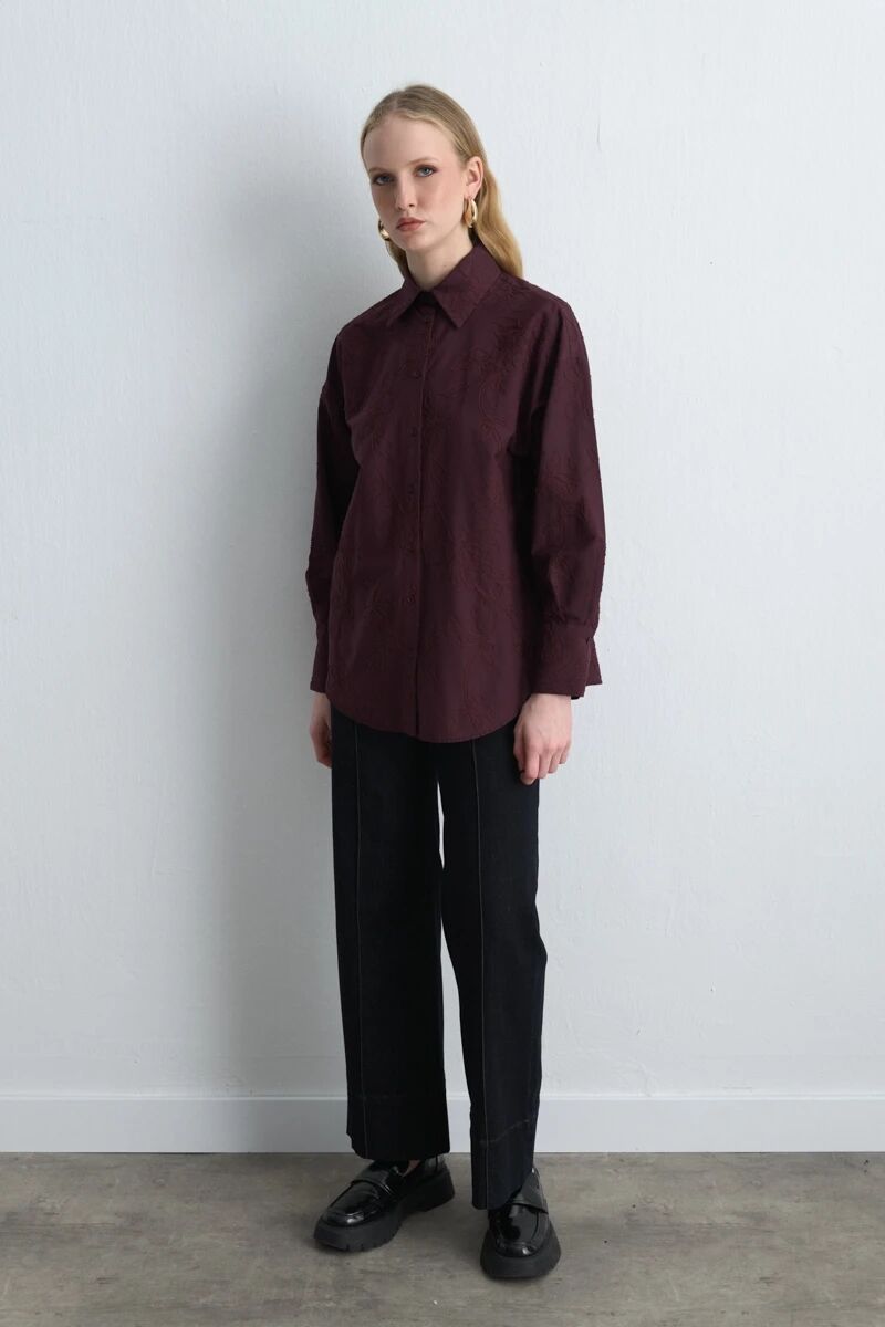 Çiçek Nakışlı Koton Gömlek - Bordo