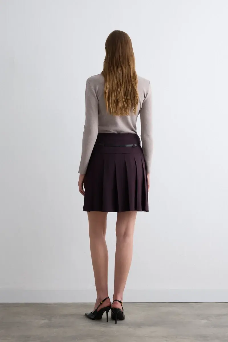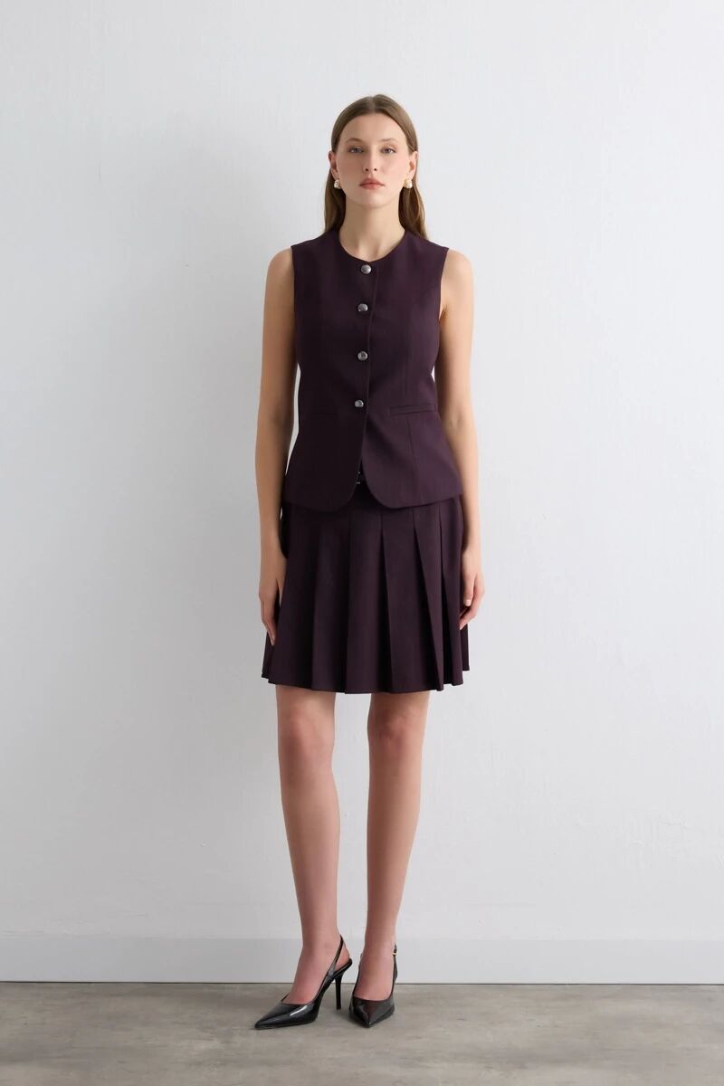 Çizgili Klasik Yelek & Pilikaşe Kemerli Mini Etek - Mürdüm Takım