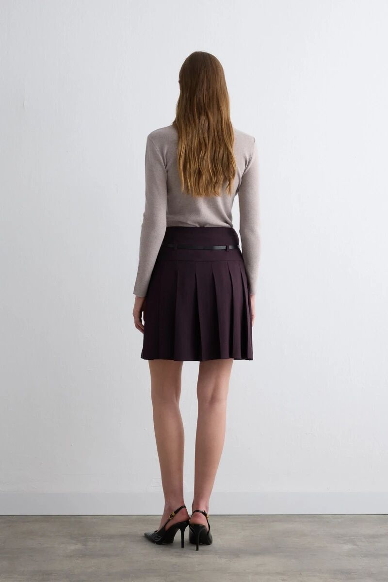 Çizgili Pilikaşe Kemerli Mini Etek - Mürdüm