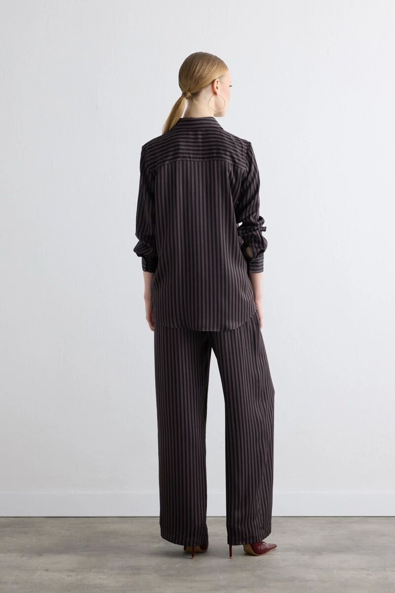 Çizgili Saten Gömlek & Bol Paça Pantolon - Kahverengi Takım