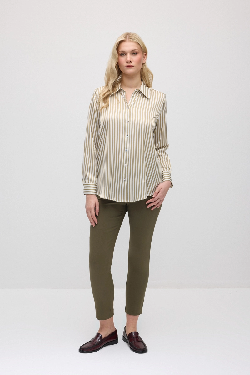 Akışkan saten dokusu ve ince çizgi deseniyle zarif bir görünüm sunar. Hafif ve pürüzsüz kumaşı sayesinde gün boyu konforlu bir kullanım sağlar. Modern ve şık duruşu farklı parçalarla kolayca kombinlenebilir. Günlük stilin yanı sıra ofis kombinlerinde de tercih edilebilecek zarif bir alternatiftir. Zamansız tasarımıyla gardırobun dikkat çeken parçalarından biri olur.