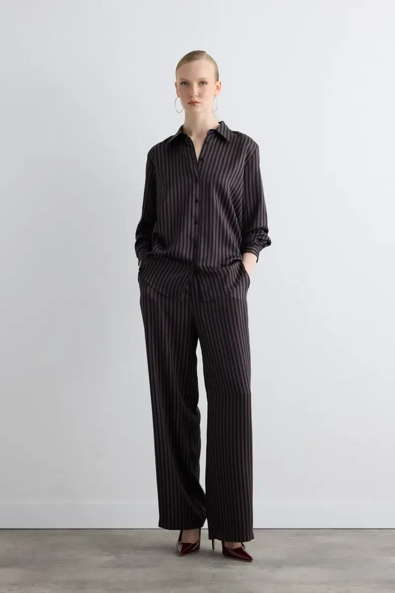 Parlak dokusu sofistike bir görünüm kazandırır. Çizgili deseni modern bir hava katar. Kahverengi tonu sıcak bir şıklık sunar. Rahat kalıbıyla gün boyu konfor sağlar. Hem klasik hem casual kombinlere uyarlanabilir.