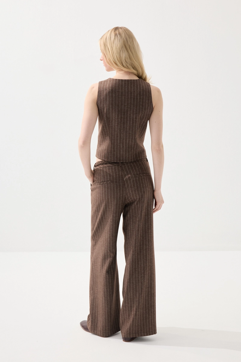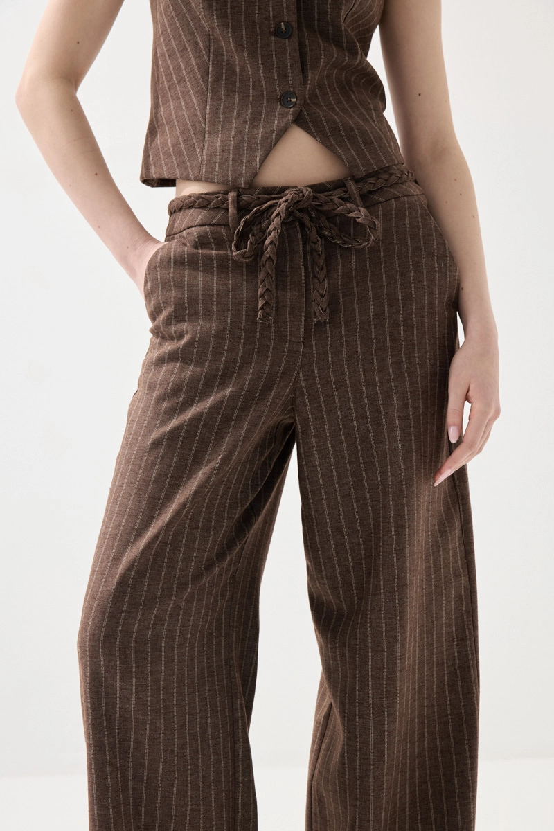 Çizgili deseni ve örgü kemer detayıyla şık bir görünüm sunan bu keten pantolon, hafif ve nefes alabilen yapısıyla konfor sağlar. Rahat kesimi sayesinde gün boyu hareket özgürlüğü sunar. Doğal dokusu ile özellikle sıcak havalar için ideal bir tercihtir. Günlük ve şık kombinlere kolayca uyum sağlar. Zarif ve modern bir stil oluşturur.