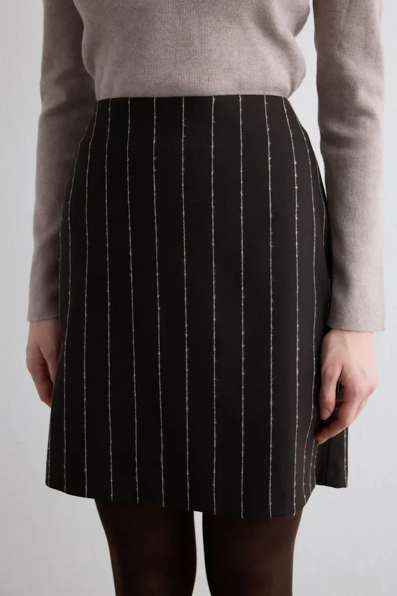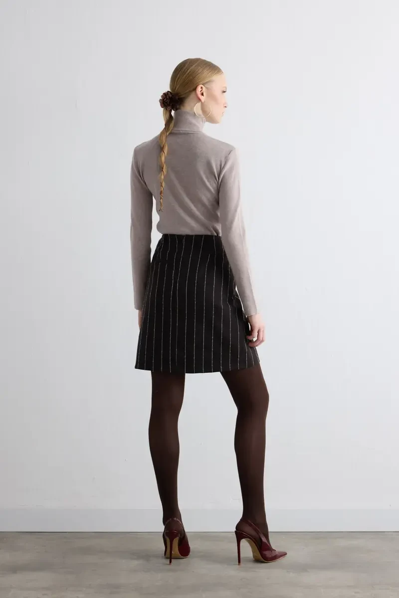 Çizgili detayları modern bir görünüm sağlar. Yünlü dokusu soğuk havalarda sıcaklık sunar. Kahverengi tonuyla farklı üstlerle uyum sağlar. Mini boyu stilin öne çıkmasına yardımcı olur. Günlük ve ofis kombinlerinde tercih edilebilir.