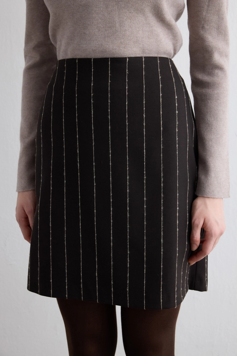The striped details give a modern appearance. The wool texture provides warmth in cold weather. The brown tone matches various tops. Its mini length enhances the style. Suitable for daily and office outfits.