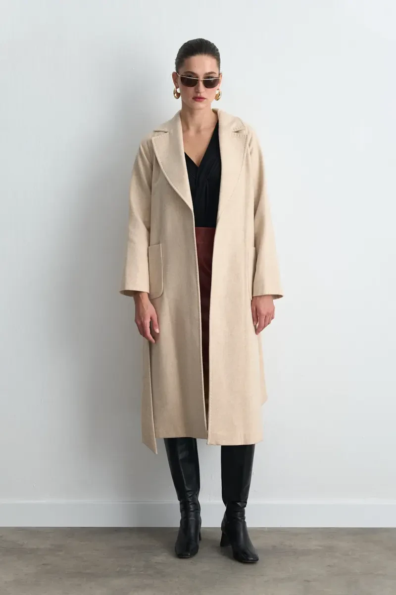 The beige classic wool coat, a key to timeless elegance, keeps you warm on cold days while offering a sophisticated look. Its high-quality wool fabric provides a soft texture and long-lasting wear. Classic cut and simple design easily match any outfit. Whether for office style or everyday city looks, the elegant beige tone always delivers a modern and refined appearance.