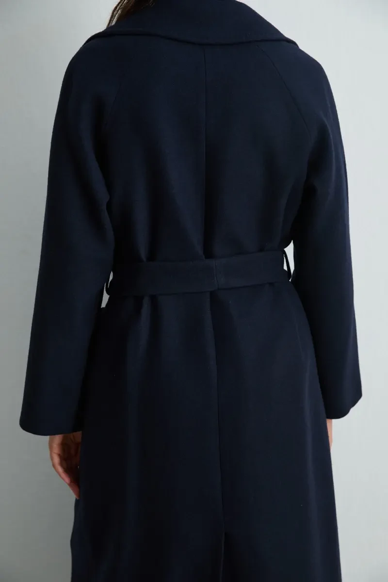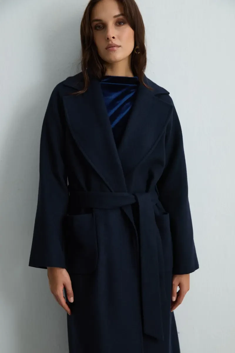 This coat in navy tones combines classic elegance and complements both office and special occasion outfits. Its soft texture and high-quality wool provide all-day comfort. With minimal details, it is a refined outerwear piece suitable for any style.