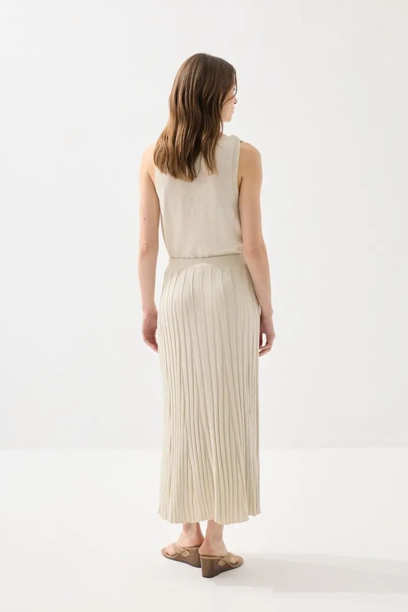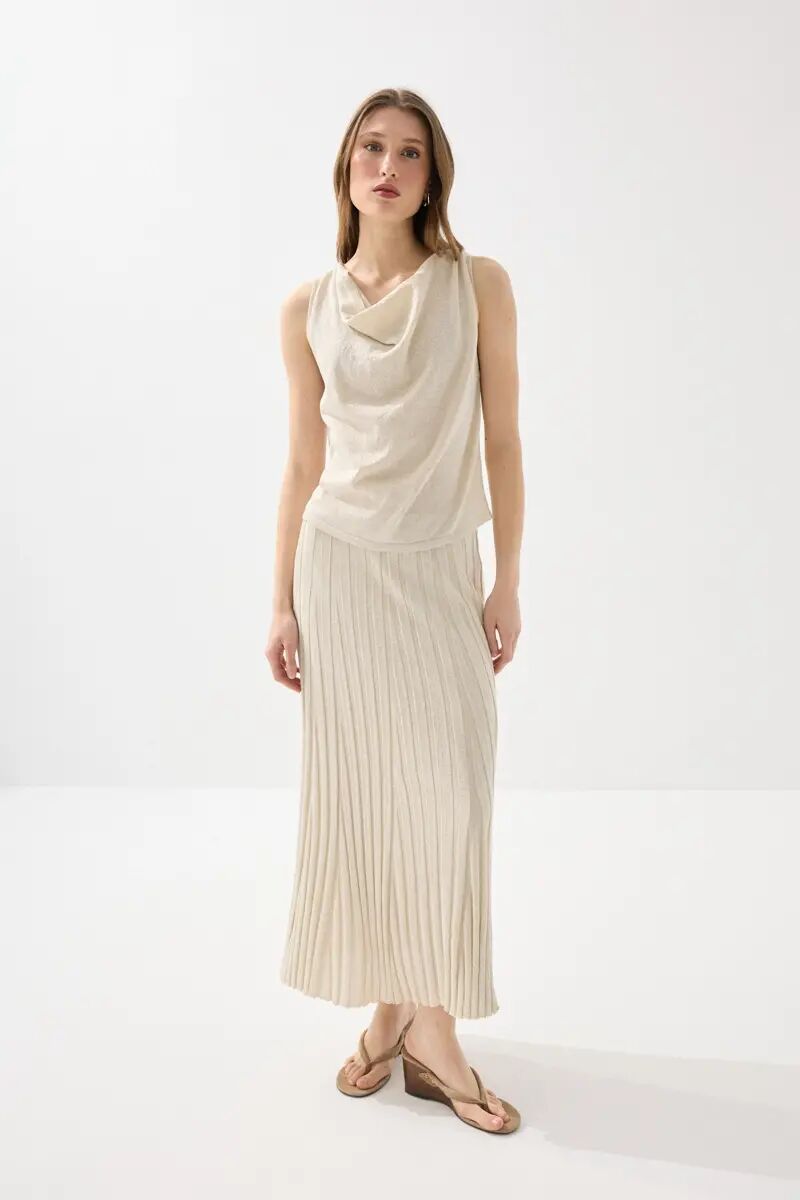Degaje Yaka Simli Viskon Triko Bluz & Pilise Etek - Bej