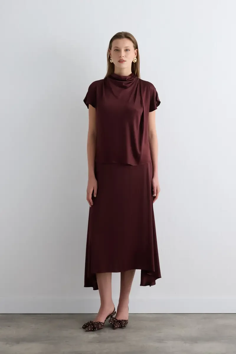 Akışkan yapısı zarif bir görünüm kazandırır. Degaje yaka detayı feminen bir duruş sunar. Bordo tonu sofistike bir hava oluşturur. Işıltılı dokusu özel günlerde dikkat çeker. Rahat kesimi konforlu kullanım sağlar.