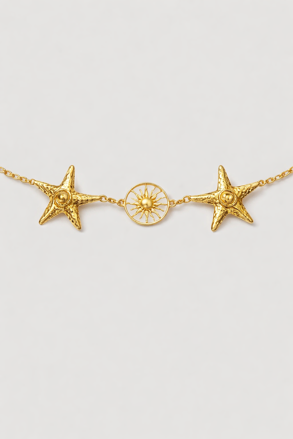Deniz yıldızı figürleriyle tasarlanan gold zincir kemer, yaz stiline enerjik ve feminen bir dokunuş katar. Hafif ve dikkat çekici yapısıyla elbiseler ve yüksek bel parçalarla uyum sağlar. Sahil kombinlerinden şehir şıklığına kadar birçok stile rahatlıkla adapte olur.