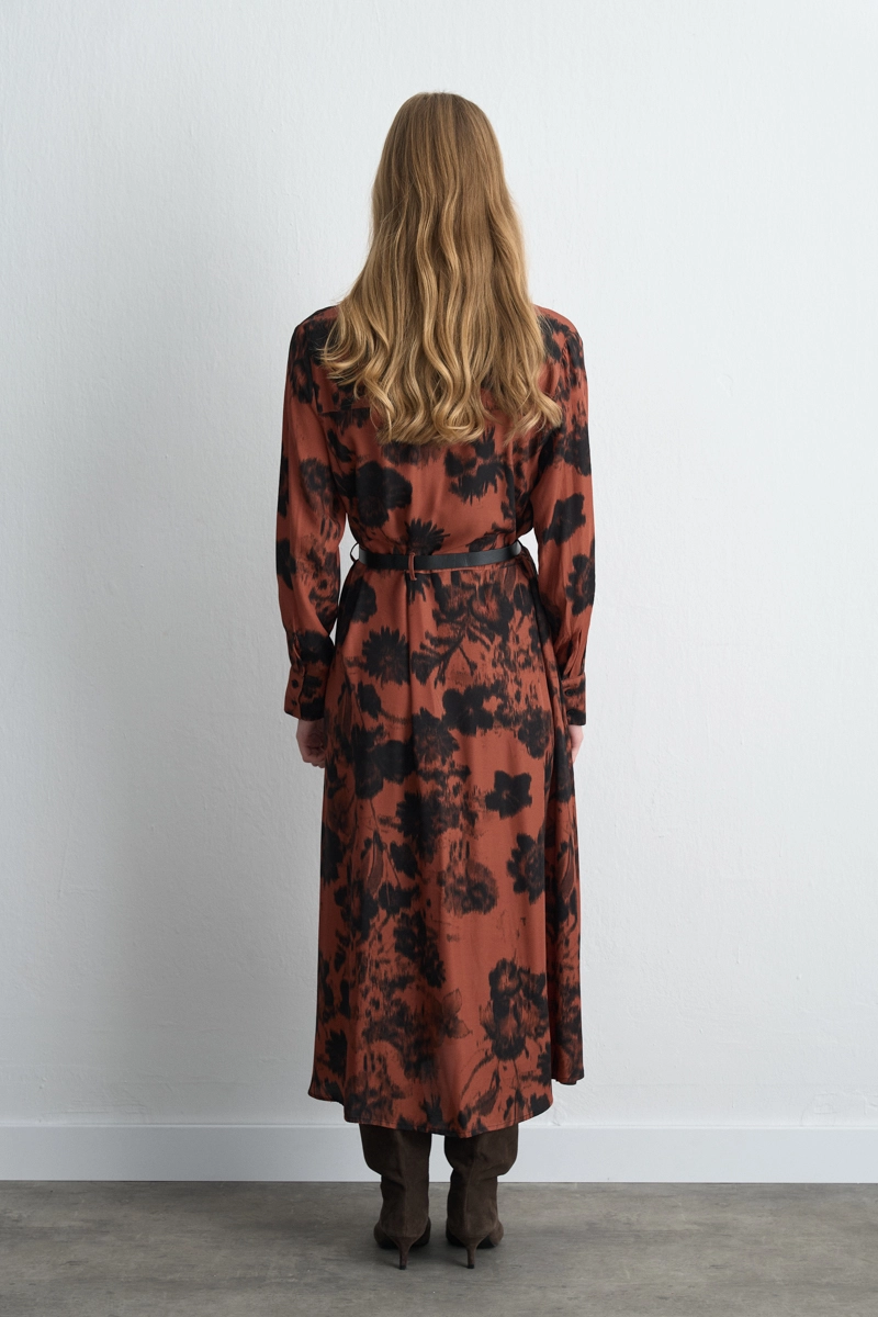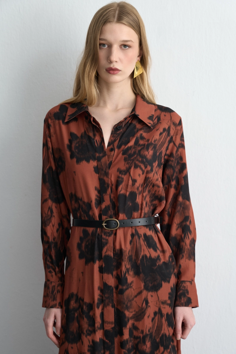 Kiremit tonlarıyla sıcak ve enerjik bir görünüm sunar. Desenli dokusu modern ve hareketli bir duruş kazandırır. Uzun formu feminen bir zarafet oluşturur. Hafif kumaşı gün boyu rahat bir kullanım sağlar. Günlük şıklık ve şehirli stil için ideal bir tercihtir.