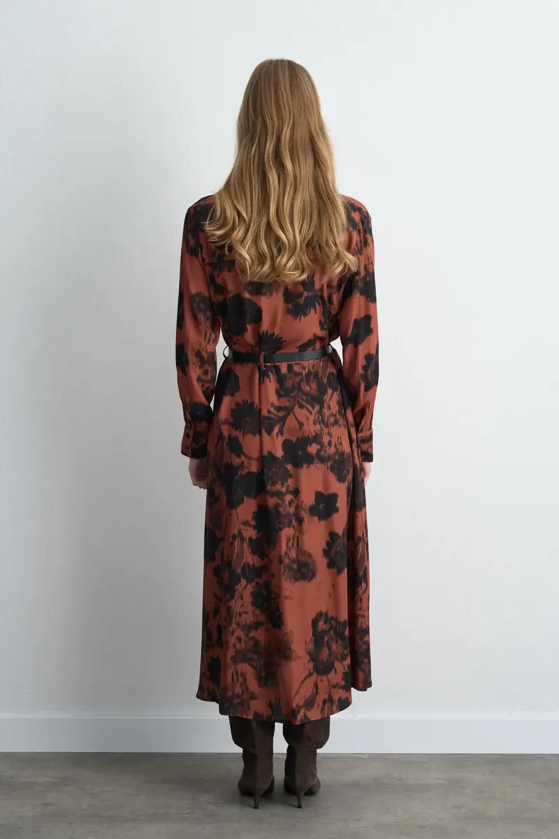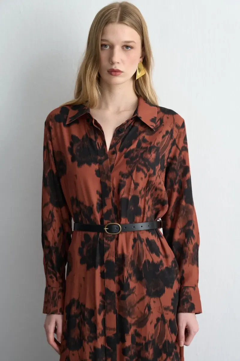 The terracotta tones offer a warm and energetic appearance. The patterned texture provides a modern and dynamic look. The long form creates feminine elegance. The lightweight fabric ensures all-day comfort. It is ideal for daily chic and urban style.