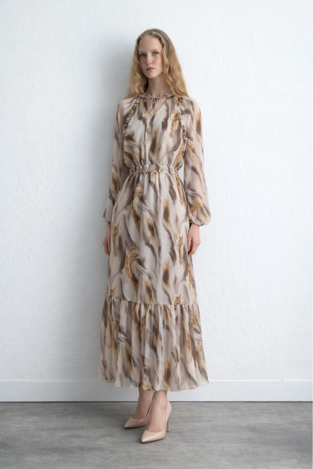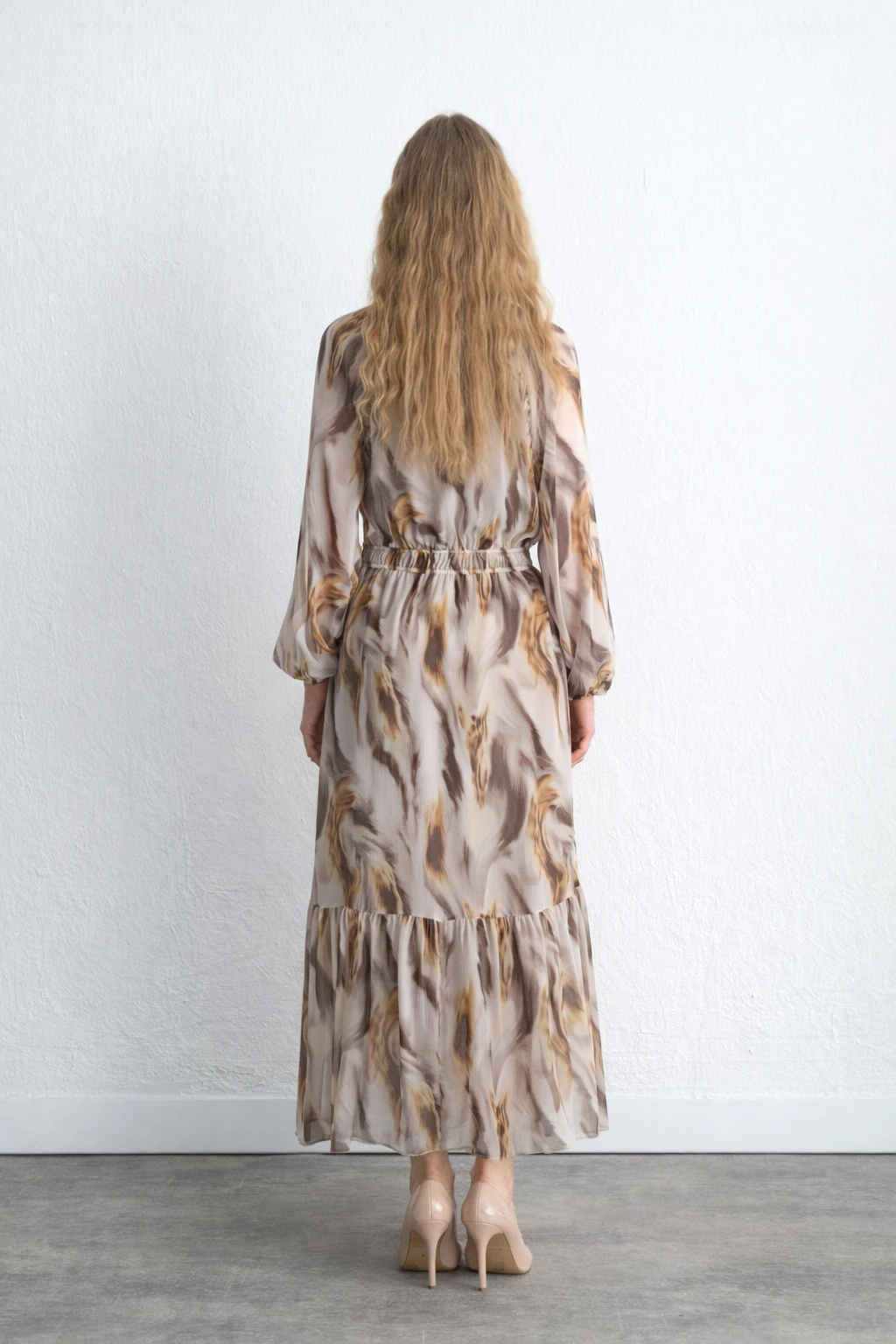 Patterned Long Chiffon Dress Beige