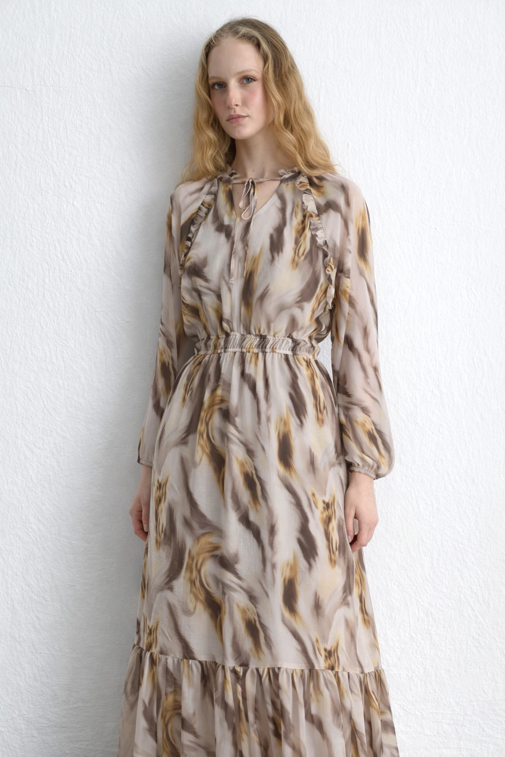 Its Lightweight Chiffon Texture Adds A Romantic Touch. The Patterned Structure Creates A Lively Look. The Beige Tone Provides A Natural And Elegant Appearance. Its Long Form Can Be Worn In Both Daytime And Evening Outfits.