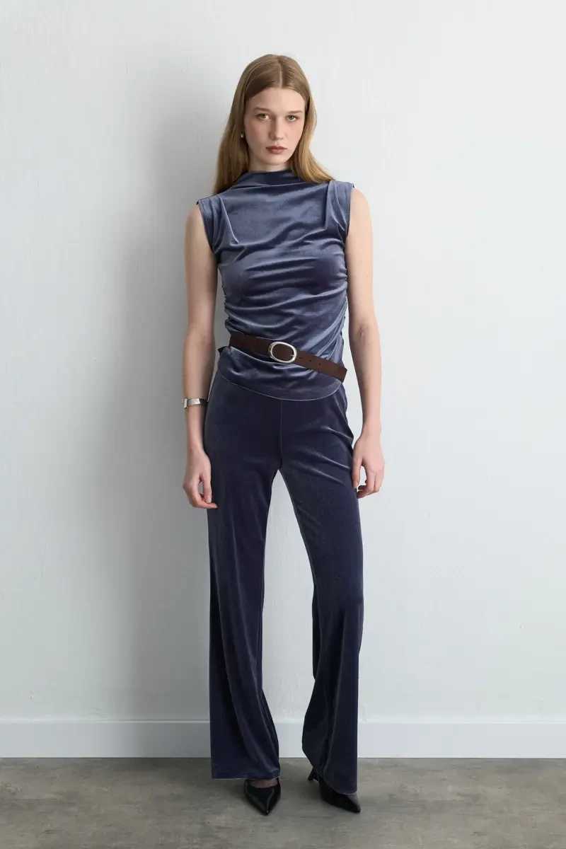 Modern gri tonu ve kadife dokusuyla sofistike bir görünüm kazandıran bu bluz, şıklığıyla öne çıkar. Dik yakası ve büzgü detayları feminen bir siluet sunarken, zamansız bir zarafet oluşturur. Günlük şıklıktan akşam kombinlerine kadar geniş bir kullanım alanı vardır. Parlak takılar ve şık bir pantolonla kombinlenerek elegan bir stil elde edilir.