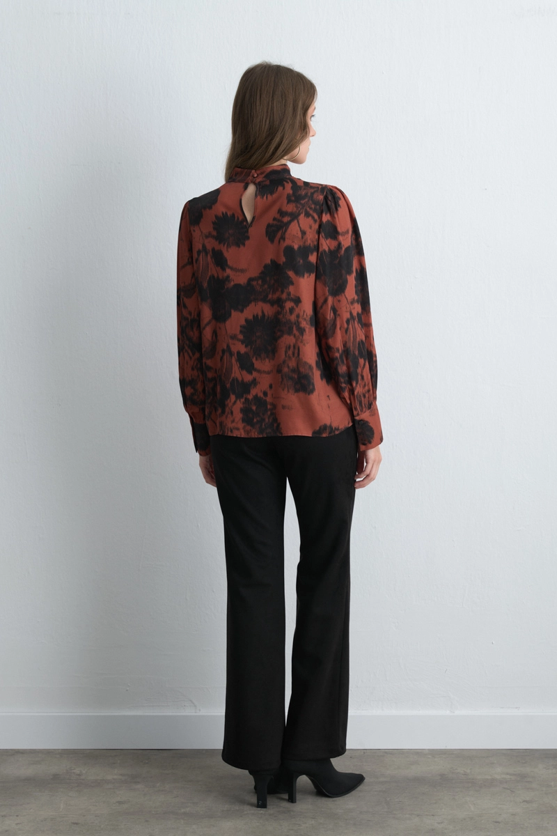 Canlı kiremit tonuyla enerjik bir görünüm sunan bu bluz, hafif viskon kumaşı sayesinde gün boyu konfor sağlar. Dik yaka detayı modern bir şıklık katarken, desenleriyle dinamik bir tarz oluşturur. Günlük hayatta jeanlerle, ofis ortamında ise klasik pantolonlarla kombinlenebilir. Hem rahat hem de dikkat çekici bir alternatiftir.