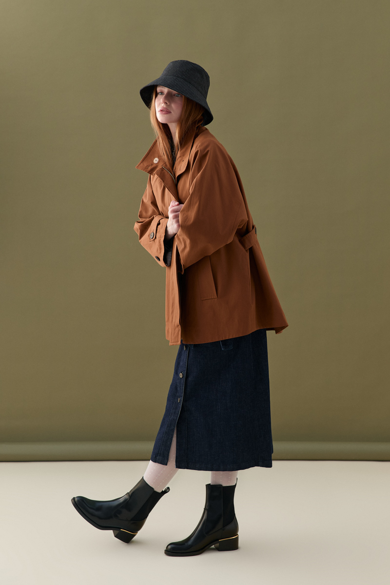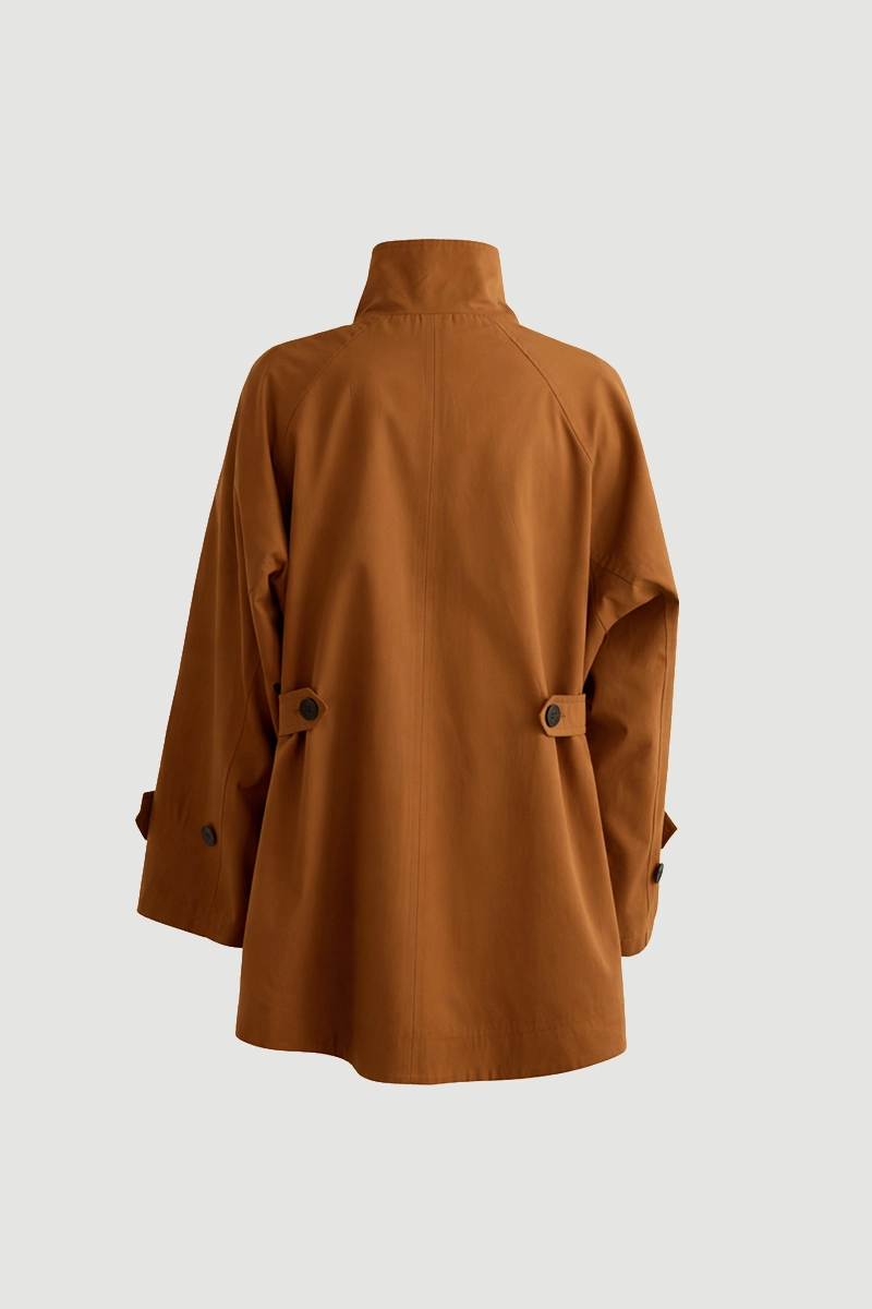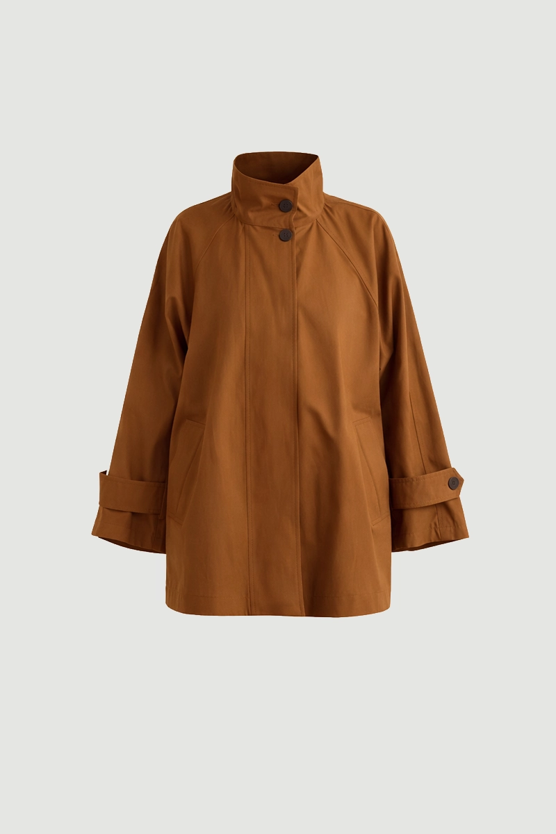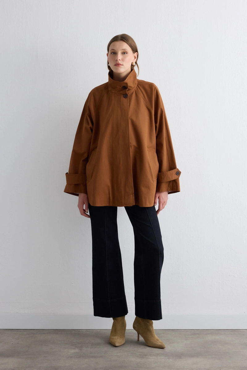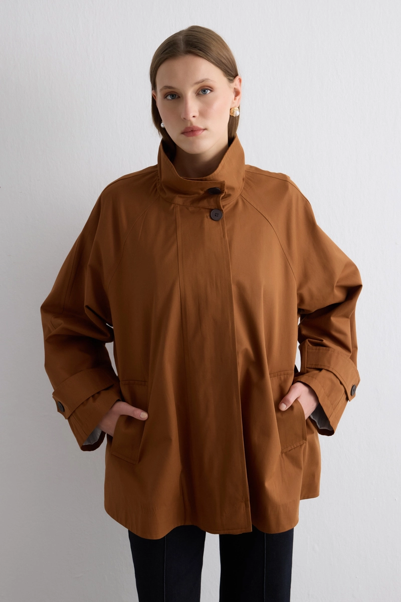 Dik yakası ile zarif ve sofistike bir görünüm kazandırır. Su itici özelliği sayesinde her hava koşulunda koruma sağlar. Taba tonuyla sonbahar kombinlerini tamamlar. Hafif yapısı rahat bir kullanım sunar. Minimal detaylarla klasik tarzı modern dokunuşlarla buluşturur.