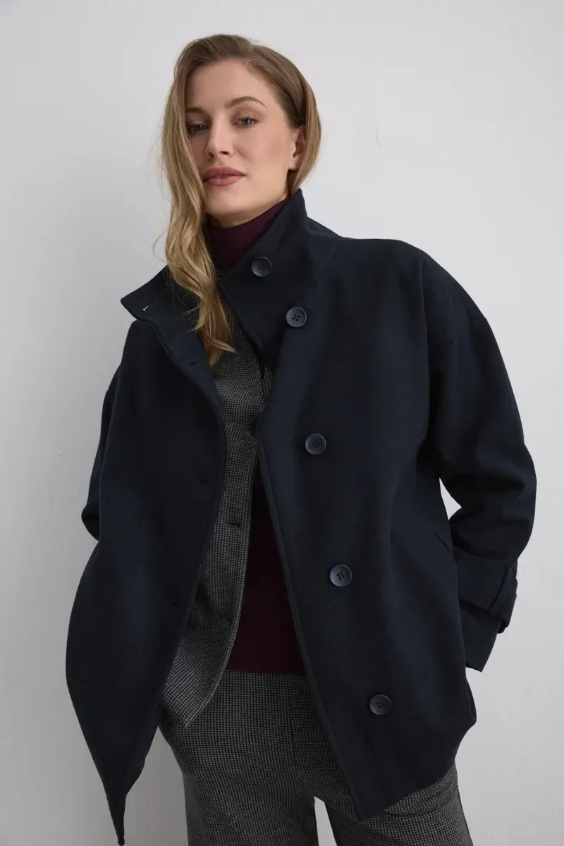 Dik yaka kesimiyle modern bir duruş sergiliyor. Yün karışımlı dokusu sıcaklık sağlarken, lacivert tonu klasik şıklığı yansıtıyor. Mevsim geçişlerinde kurtarıcı bir parça olarak öne çıkıyor.