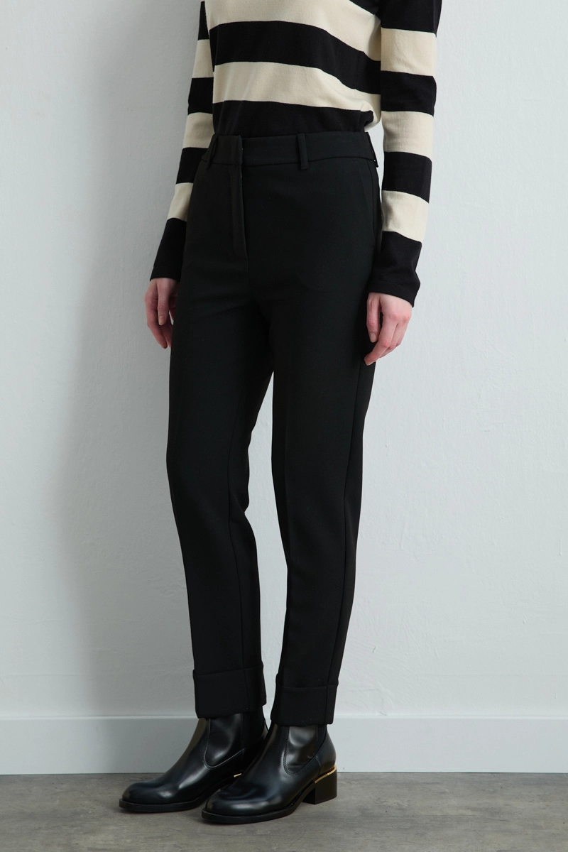 Black high-waist pants with double-hem details create a modern silhouette. Suitable for both daily and special outfits. Minimal design, when paired with stylish blouses or shirts, results in an impressive look.