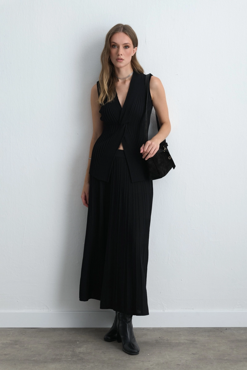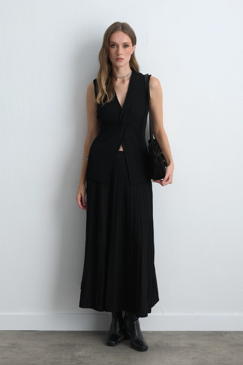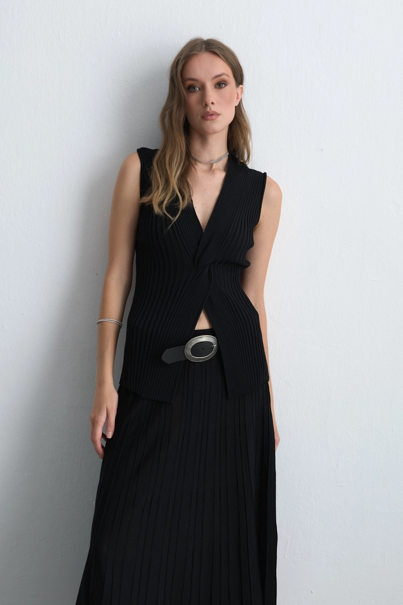 Modern düğüm detayıyla hareketlendirilen siyah viskon triko bluz, şıklığı ve rahatlığı bir arada sunar. Yumuşak dokusu sayesinde gün boyu konfor sağlar. Minimalist tasarımı sayesinde ofis kombinlerinden günlük stilinize kadar farklı ortamlarda rahatlıkla kullanılabilir.