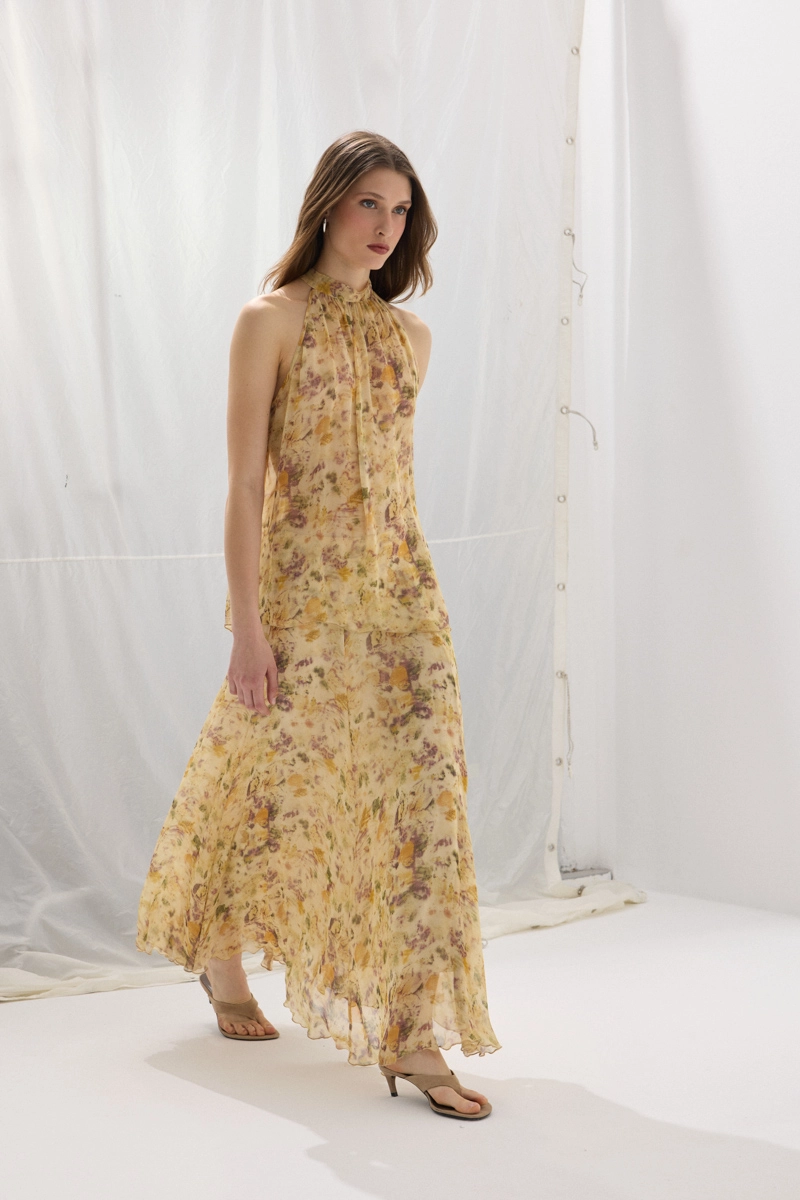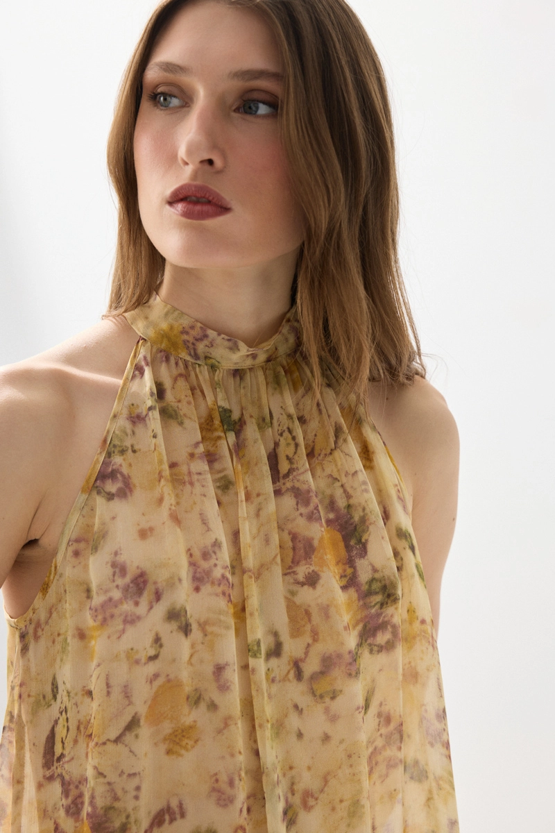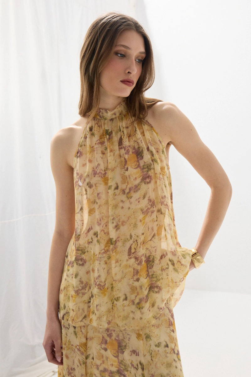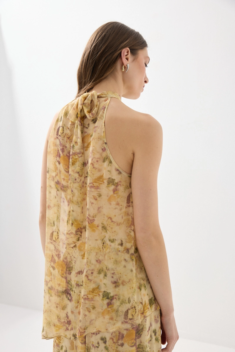 Eco print detaylarıyla öne çıkan asimetrik şifon bluz, hafif ve akıcı yapısıyla zarif bir görünüm sunar. Asimetrik kesimiyle modern bir stil yaratır. Bej tonlarıyla doğal ve sofistike kombinler oluşturabilirsiniz. Günlük ve şık kullanım için idealdir. Sanatsal ve dikkat çekici bir parçadır.