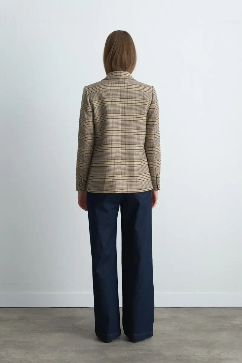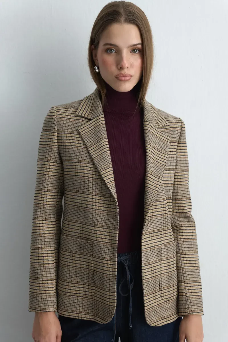 Ekose deseniyle retro bir dokunuş kazandırır. Bej tonu kombinlerde doğal bir denge sağlar. Klasik blazer kesimi şıklığı garanti eder. Pantolon ya da eteklerle tamamlandığında güçlü bir stil ortaya çıkar.