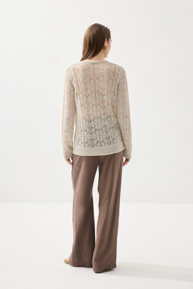 This short-sleeve cardigan, featuring an openwork knit texture, offers an elegant and stylish look while ensuring comfortable wear with its lightweight structure. Its breathable design provides all-day freshness. Ideal for layered outfits, it adapts to both casual and chic styles. Its soft texture leaves a pleasant feel on the skin. It is set to become one of the essential pieces in your wardrobe.